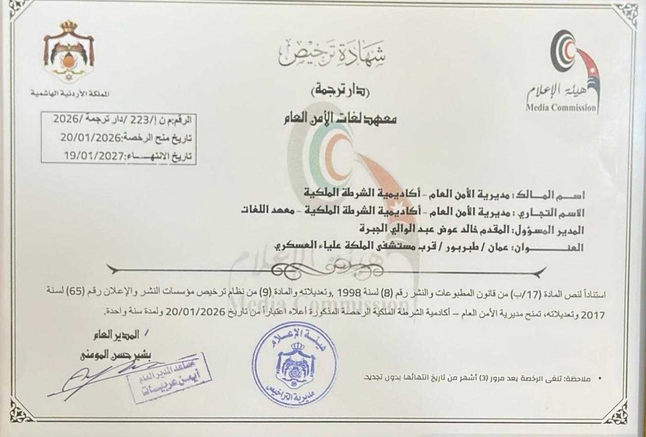 وسلّم مدير عام هيئة الإعلام، بشير المومني، رخصة دار الترجمة إلى آمر أكاديمية الشرطة الملكية العميد الركن الدكتور يوسف البداينة، بحضور عدد من كبار ضباط مديرية الأمن العام.