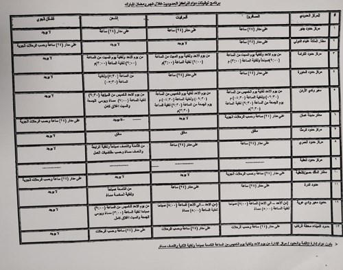 السادة المسافرون نرفق لكم الكشف المبين أدناه بما يخص أوقات دوام إدارة الإقامة والحدود والمراكز الحدودية والمعابر التابعة لها خلال شهر رمضان المبارك