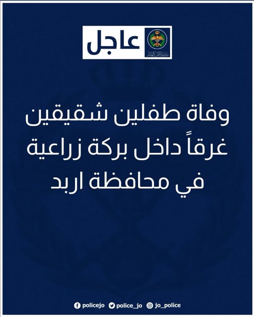 قال الناطق الإعلامي باسم مديرية الأمن العام أن فرق الغطس والاسعاف في مديرية دفاع مدني غرب اربد تعاملت مساء اليوم مع حادث غرق تعرض له طفلين شقيقين
