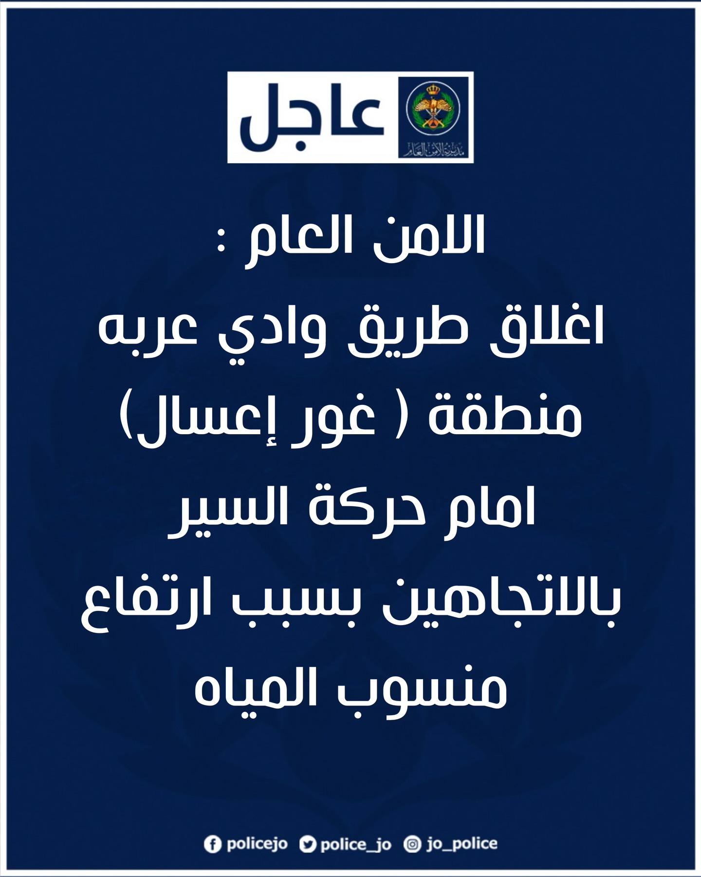 الامن العام : اغلاق جزء من طريق وادي عربه في منطقة ( غور إعسال) امام حركة السير بالاتجاهين بسبب ارتفاع منسوب المياه