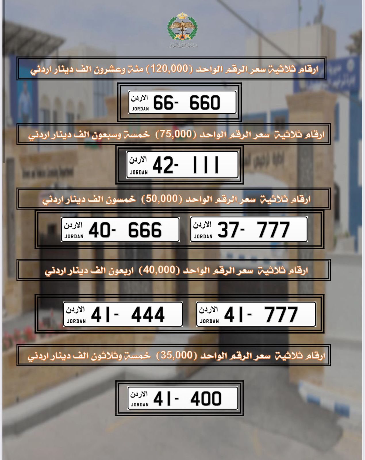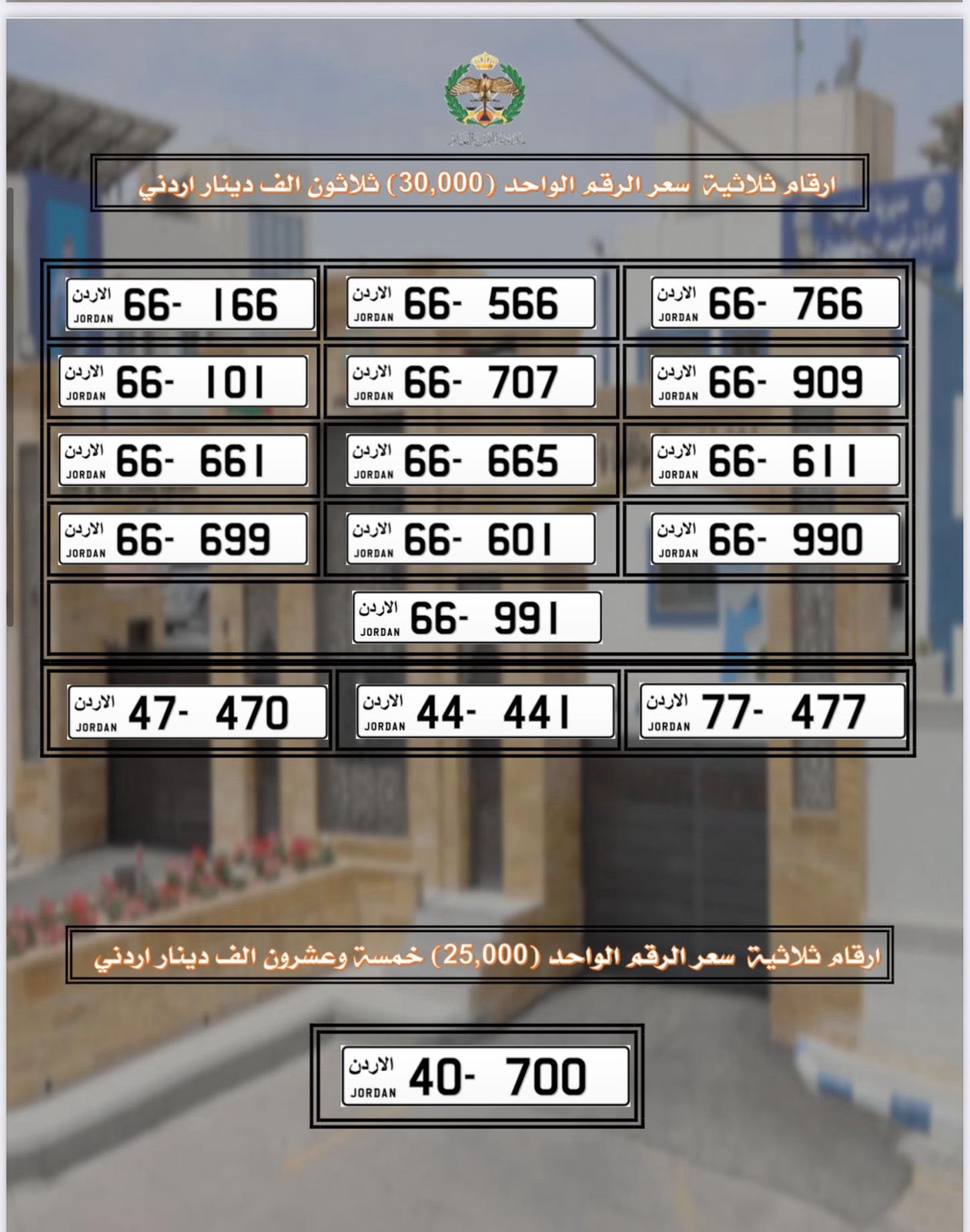 تعلن إدارة ترخيص السواقين والمركبات عن طرح مجموعة من الأرقام الأكثر تميزا من ترميز (66) ومن ترميز الخانتين المختلفتين والتي كان مقرر بيعها بالمزاد العلني للبيع المباشر من خلال البوابة الإلكترونية.