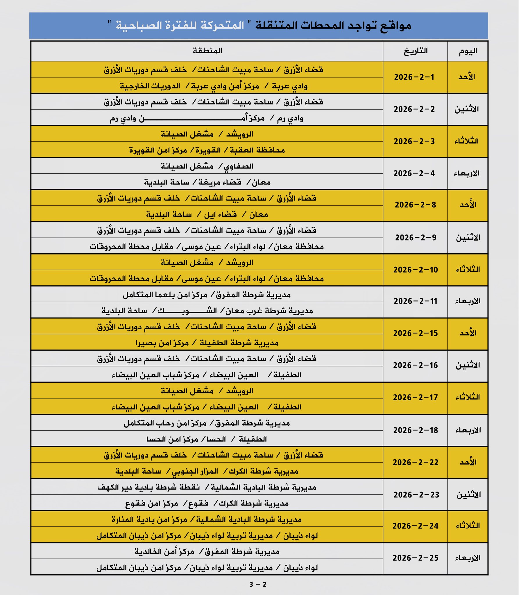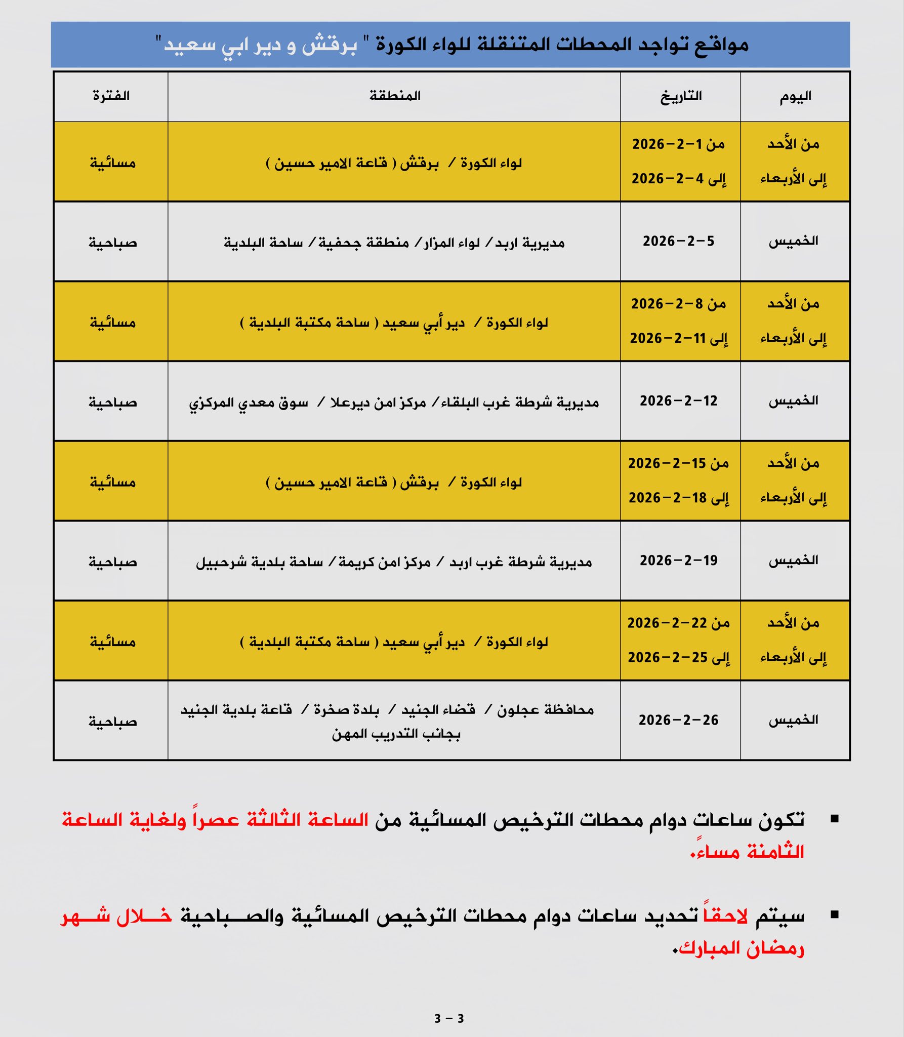 تعلن إدارة ترخيص السواقين والمركبات عن مواعيد العمل بجولات الترخيص المتنقل الصباحي والمسائي ضمن المبادرة الابتكارية ( بنوصلك ) خلال شهر شباط لعام 2026 في عدد من مناطق المملكة.