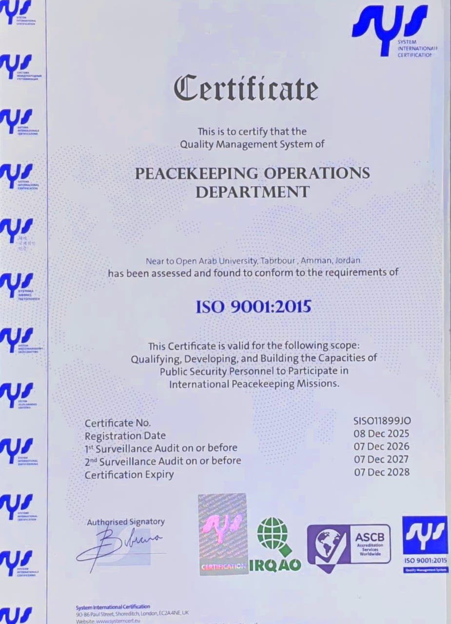حصلت إدارة عمليات حفظ السلام على شهادة الايزو ( ISO9001:2015) الدولية لنظام إدارة الجودة بعد تحقيقها متطلبات التدقيق وفق المعايير العالمية المعتمدة في تعزيز إجراءات حفظ السلام، التي تنفذها مديرية الأمن العام ضمن شراكة نوعية مع منظمة الأمم المتحدة.