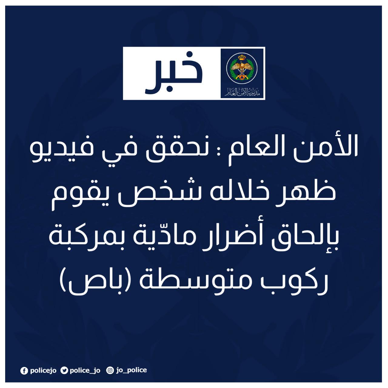 قال الناطق الإعلامي باسم مديرية الأمن العام إنّ مديرية شرطة شمال عمان تابعت التحقيق في فيديو جرى تداوله ظهر خلاله شخص يقوم بإلحاق أضرار مادّية بمركبة ركوب متوسطة (باص) .