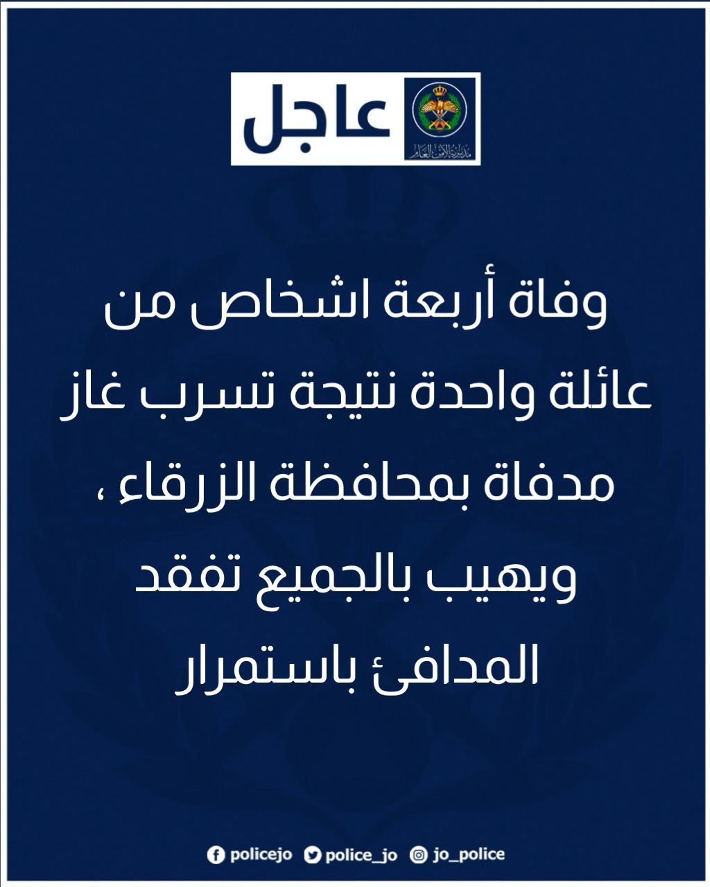 قال الناطق الإعلامي باسم مديرية الأمن العام إنه توفي مساء اليوم أربعة أشخاص من عائلة واحدة نتيجة إصابتهم بضيق في التنفس إثر تسرب غاز المدفئة بمنطقة الهاشمية بمحافظة الزرقاء .