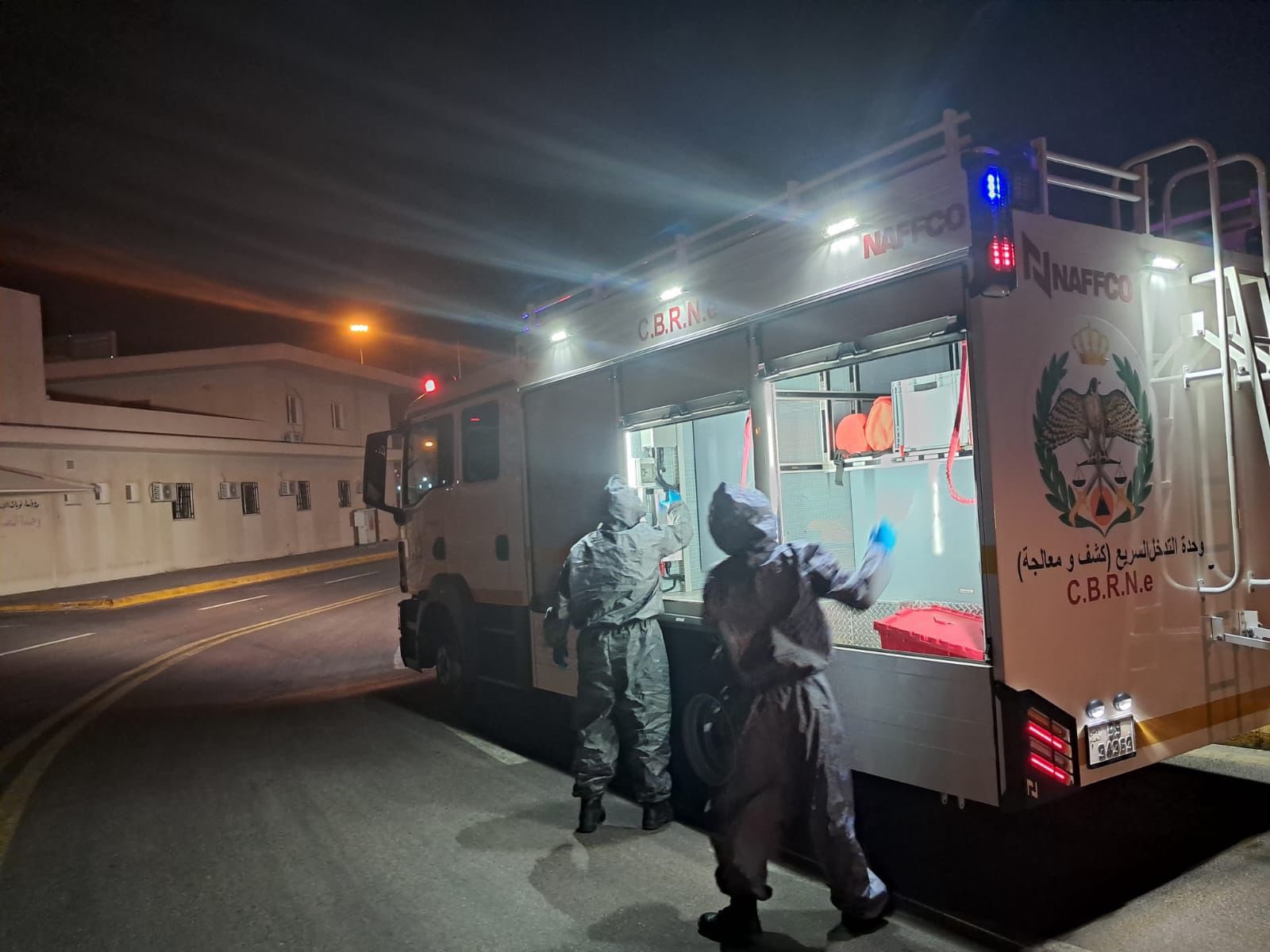*فريق المواد الخطرة في الدفاع المدني وصل فور تلقي البلاغ وقام بتطويق موقع التسرب واتخذ كافة الإجراءات العملياتية اللازمة وفق البروتوكلات بمثل هذه الحالات ، والتأكد من نسبة الغازات في الجو .