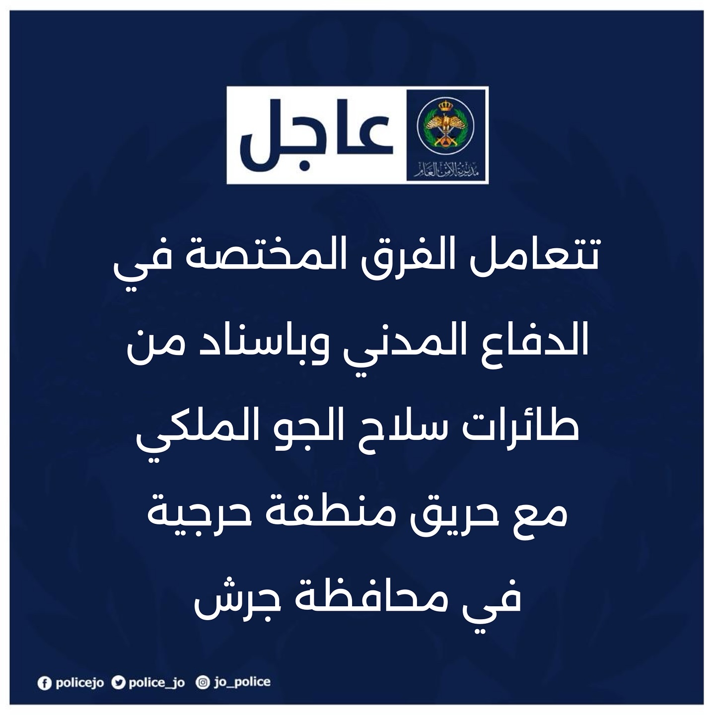 تتعامل الفرق المختصة في الدفاع المدني وباسناد من طائرات سلاح الجو الملكي مع حريق منطقة حرجية في محافظة جرش