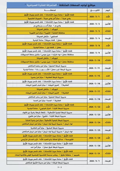 تعلن إدارة ترخيص السواقين والمركبات عن مواعيد العمل بجولات الترخيص المتنقل الصباحي والمسائي ضمن المبادرة الابتكارية ( بنوصلك ) خلال شهر آذار لعام 2026 في عدد من مناطق المملكة.