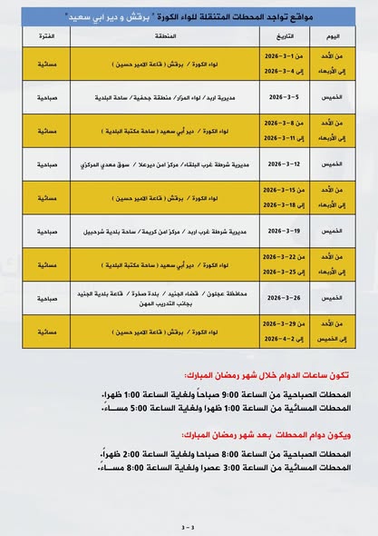 حيث ستكون ساعات الدوام خلال شهر رمضان المبارك للمحطات الصباحية من الساعة 9:00 صباحاً ولغاية الساعة 1:00 ظهرا والمحطات المسائية من الساعة 1:00 ظهرا ولغاية الساعة 5:00 مسـاءً.