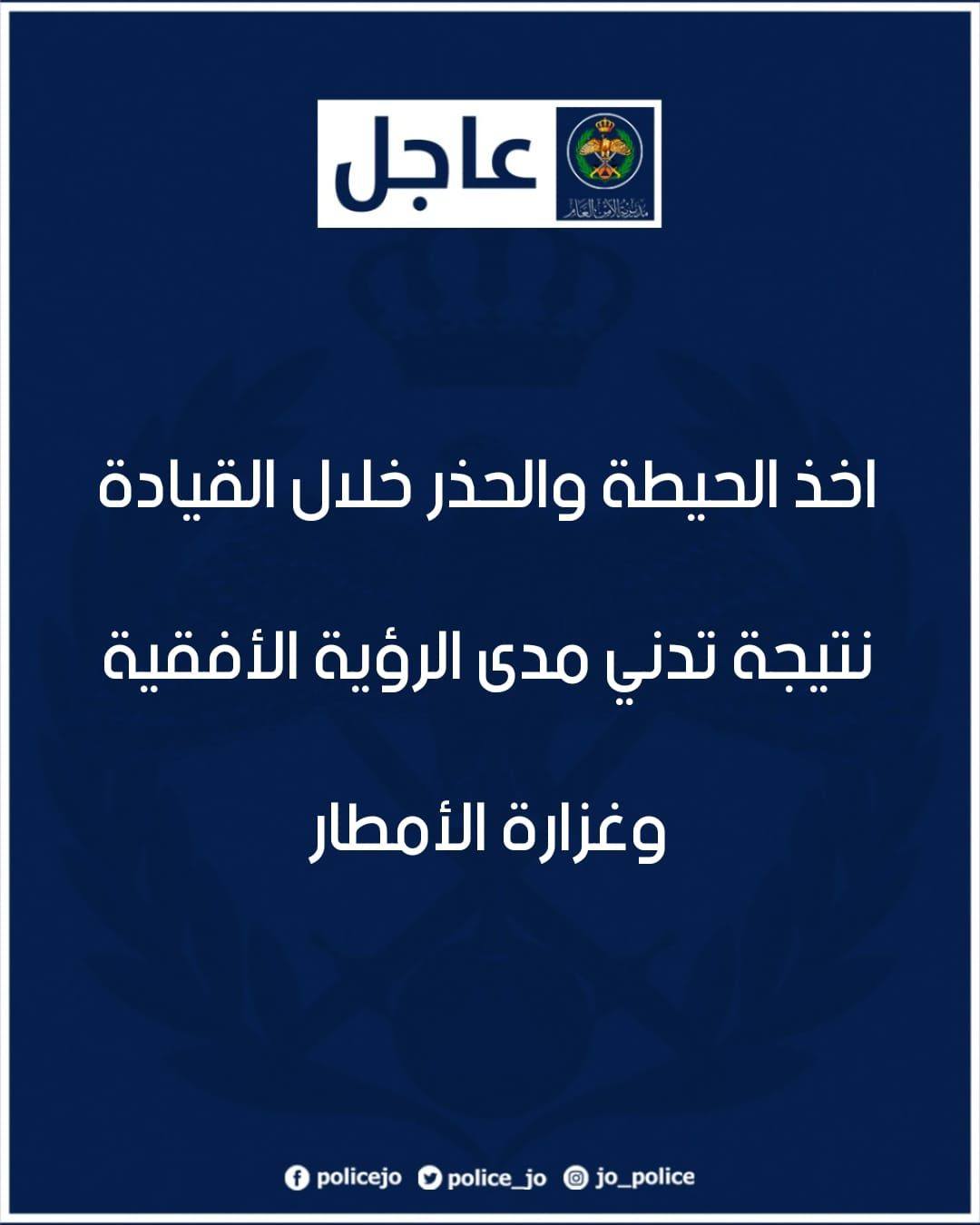 كما شددت على أهمية القيادة بحذر على الطرق التي قد تشهد هطولات مطرية، وأخذ الحيطة والحذر نتيجة تدني مدى الرؤية الأفقية بسبب الضباب فوق المرتفعات الجبلية، وبسبب الغبار في مناطق البادية.