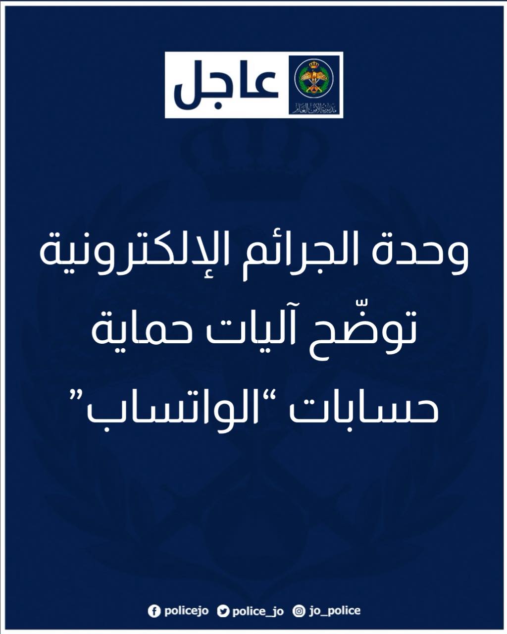 جدّدت وحدة مكافحة الجرائم الإلكترونية تحذيراتها للمواطنين والمقيمين، حول ضرورة حماية حسابهم على تطبيق الواتساب، مؤكدة أهمية اتخاذ الإجراءات اللازمة لحماية حسابات تطبيق “الواتساب” من محاولات السرقة والاختراق.