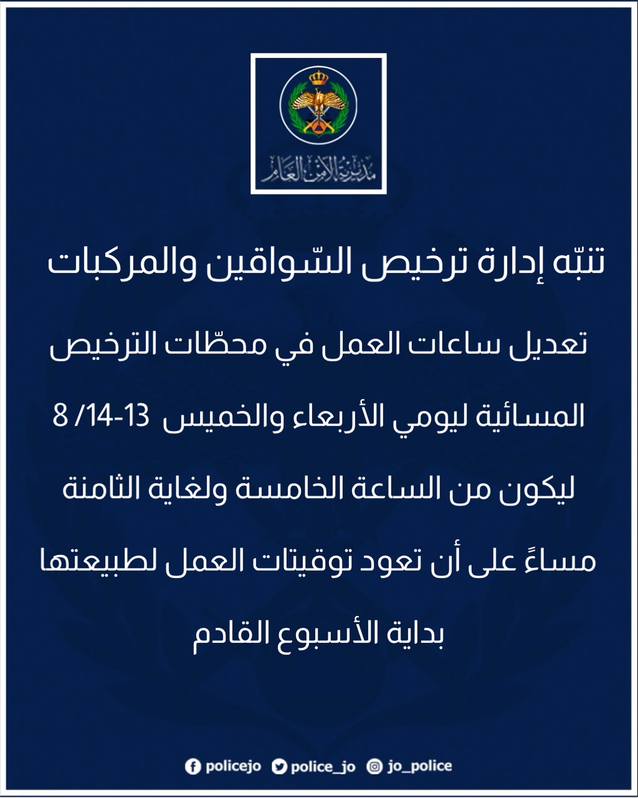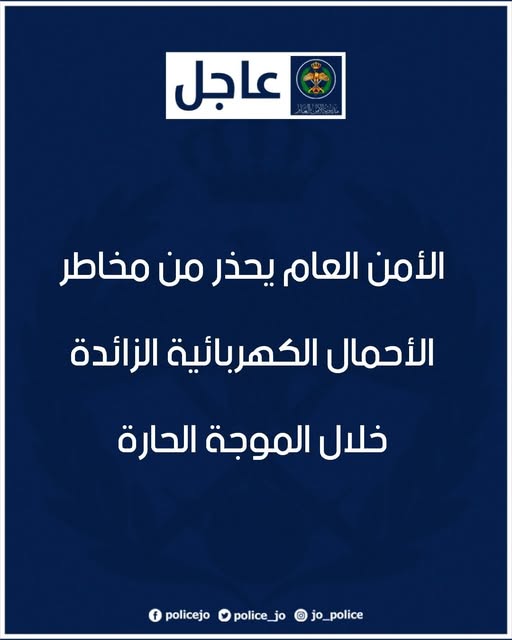 تدعو مديرية الأمن العام المواطنين إلى ضرورة أخذ الحيطة والحذر، وانتهاج السلوك السليم خلال حالة عدم الاستقرار الجوي مساء اليوم