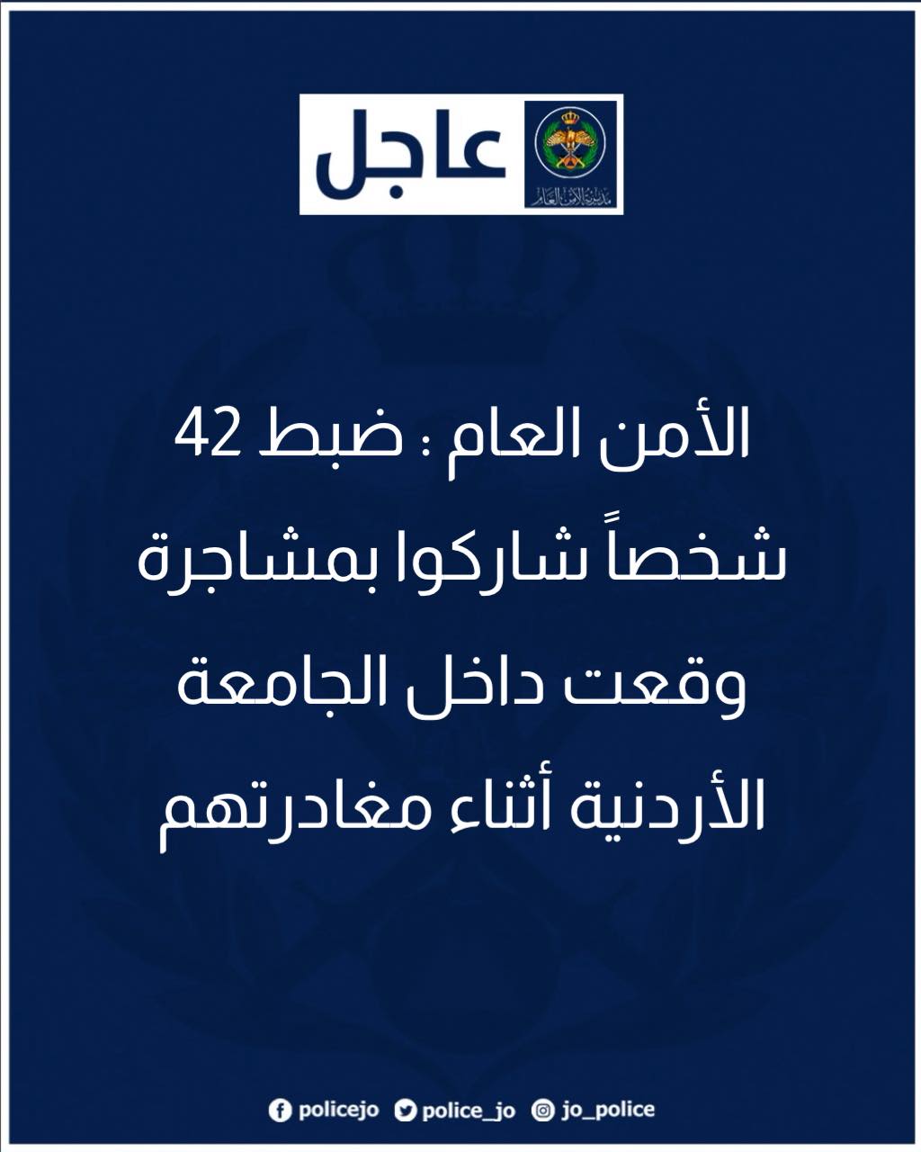 الأمن العام : ضبط 42 شخصاً شاركوا بمشاجرة وقعت داخل الجامعة الأردنية أثناء مغادرتهم