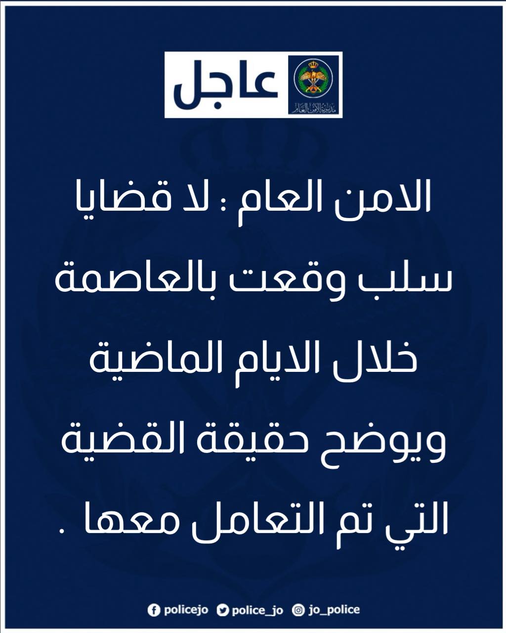 قال الناطق الاعلامي باسم مديرية الامن العام انه لم تسجل لدى الاجهزة الامنية اية قضايا سلب خلال الايام الماضية