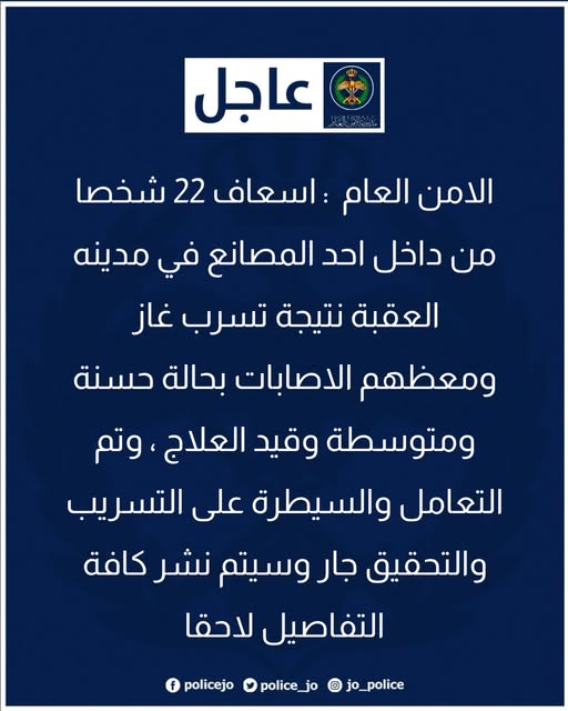 الأمن العام : اسعاف 22 شخصا من داخل احد المصانع في مدينه العقبة نتيجة تسرب غاز ومعظهم الاصابات بحالة حسنة