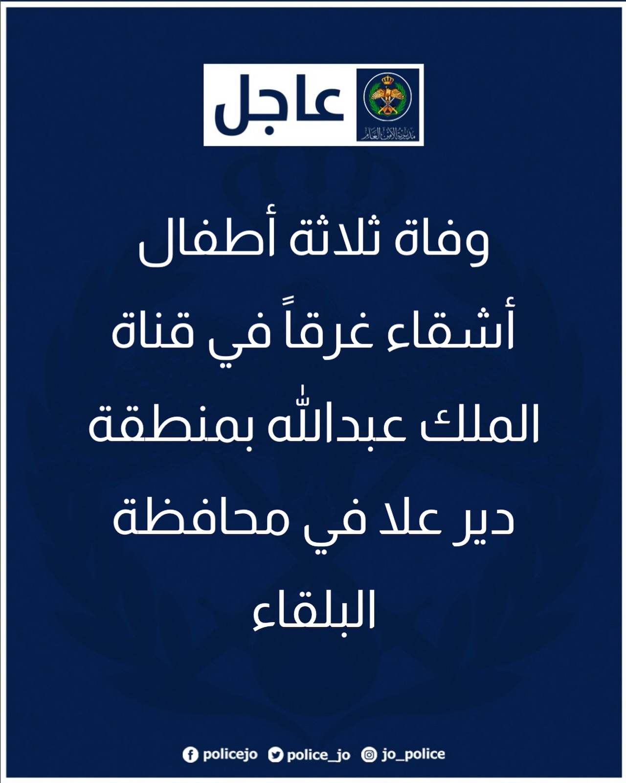 وفاة ثلاثة أطفال أشقاء غرقاً في قناة الملك عبدالله بمنطقة دير علا في محافظة البلقاء