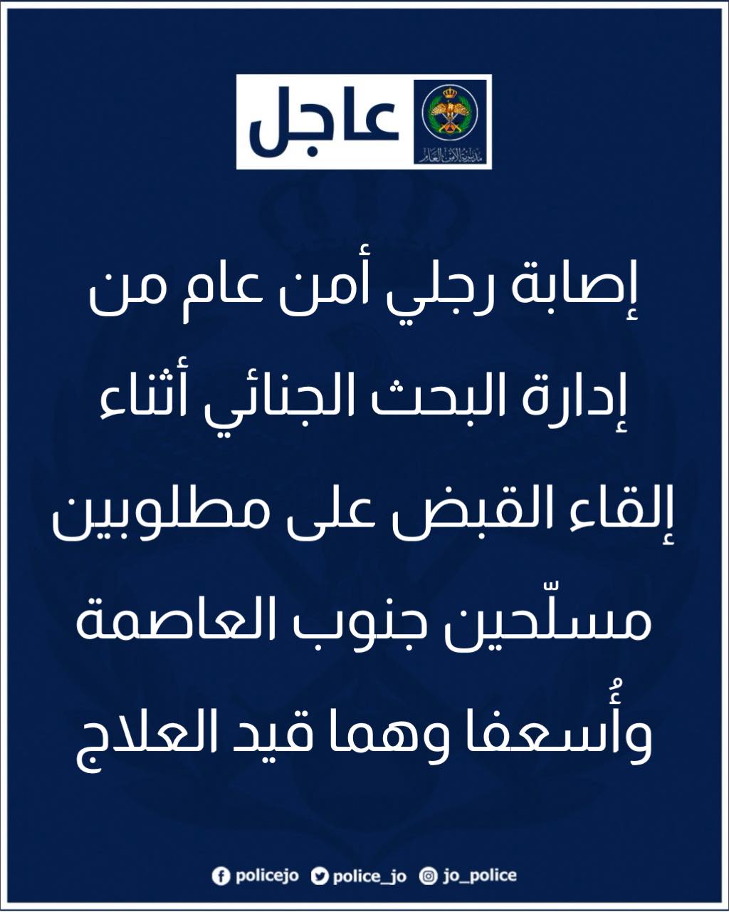 إصابة رجلي أمن عام من إدارة البحث الجنائي أثناء إلقاء القبض على مطلوبين مسلّحين جنوب العاصمة وأُسعفا وهما قيد العلاج