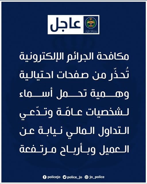مكافحة الجرائم الإلكترونية تُحذّر من صفحات احتيالية تحمل أسماء لشخصيات عامّة وتدّعي التداول المالي بأرباح مرتفعة