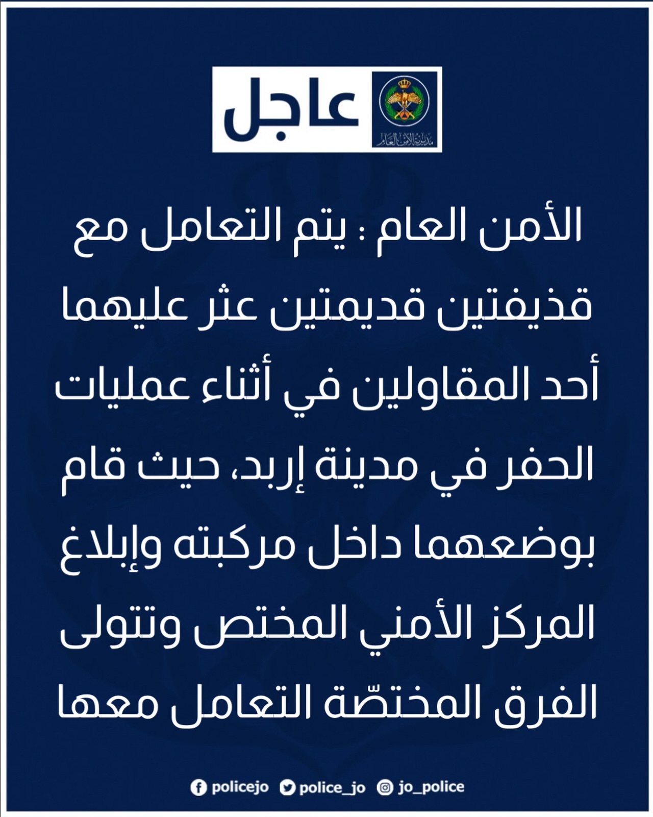 الأمن العام: التعامل مع قذيفتين قديمتين عثر عليهما أحد المقاولين أثناء عمليات الحفر في مدينة إربد