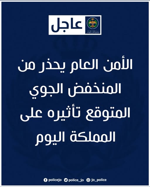 حذرت مديرية الأمن العام من المنخفض الجوي المتوقع تأثيره على المملكة اليوم الاربعاء حيث تنخفض درجات الحرارة وتهطل زخات من المطر