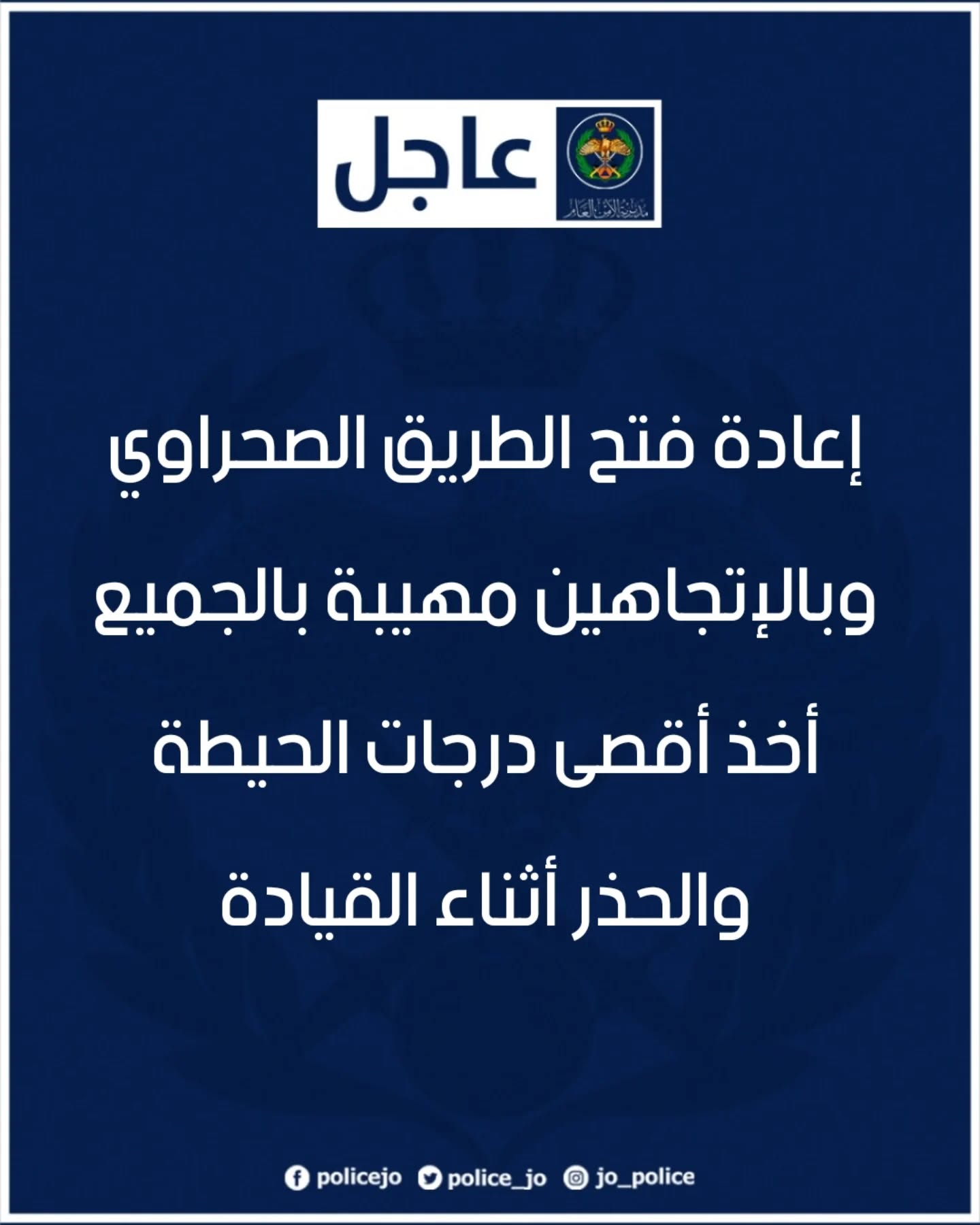 الأمن العام : إعادة فتح الطريق الصحراوي وبالإتجاهين، مهيبة بالجميع أخذ أقصى درجات الحيطة والحذر