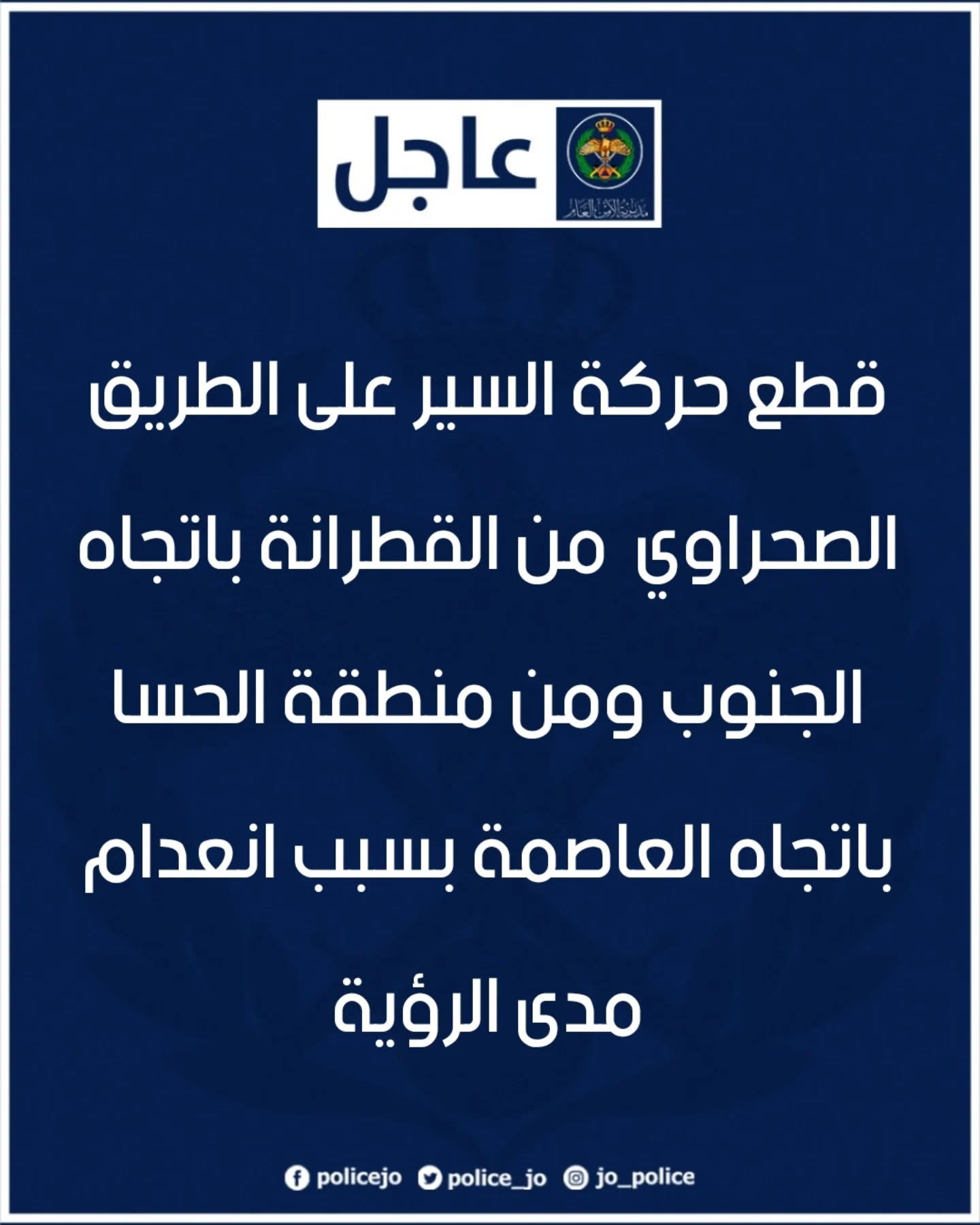 الأمن العام : قطع حركة السير على الطريق الصحراوي من القطرانة باتجاه الجنوب ومن منطقة الحسا باتجاه العاصمة بسبب انعدام مدى الرؤية