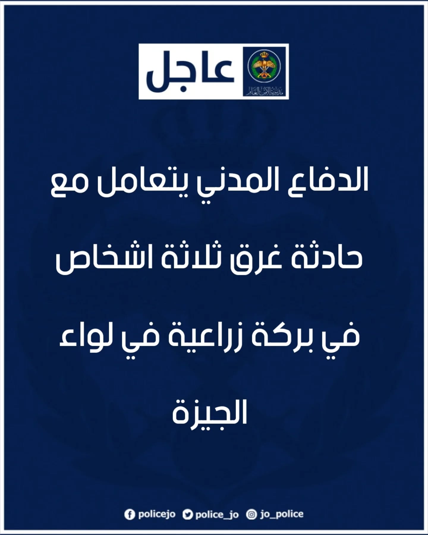 الأمن العام : الدفاع المدني يتعامل مع حادثة غرق ثلاثة اشخاص في بركة زراعية في لواء الجيزة