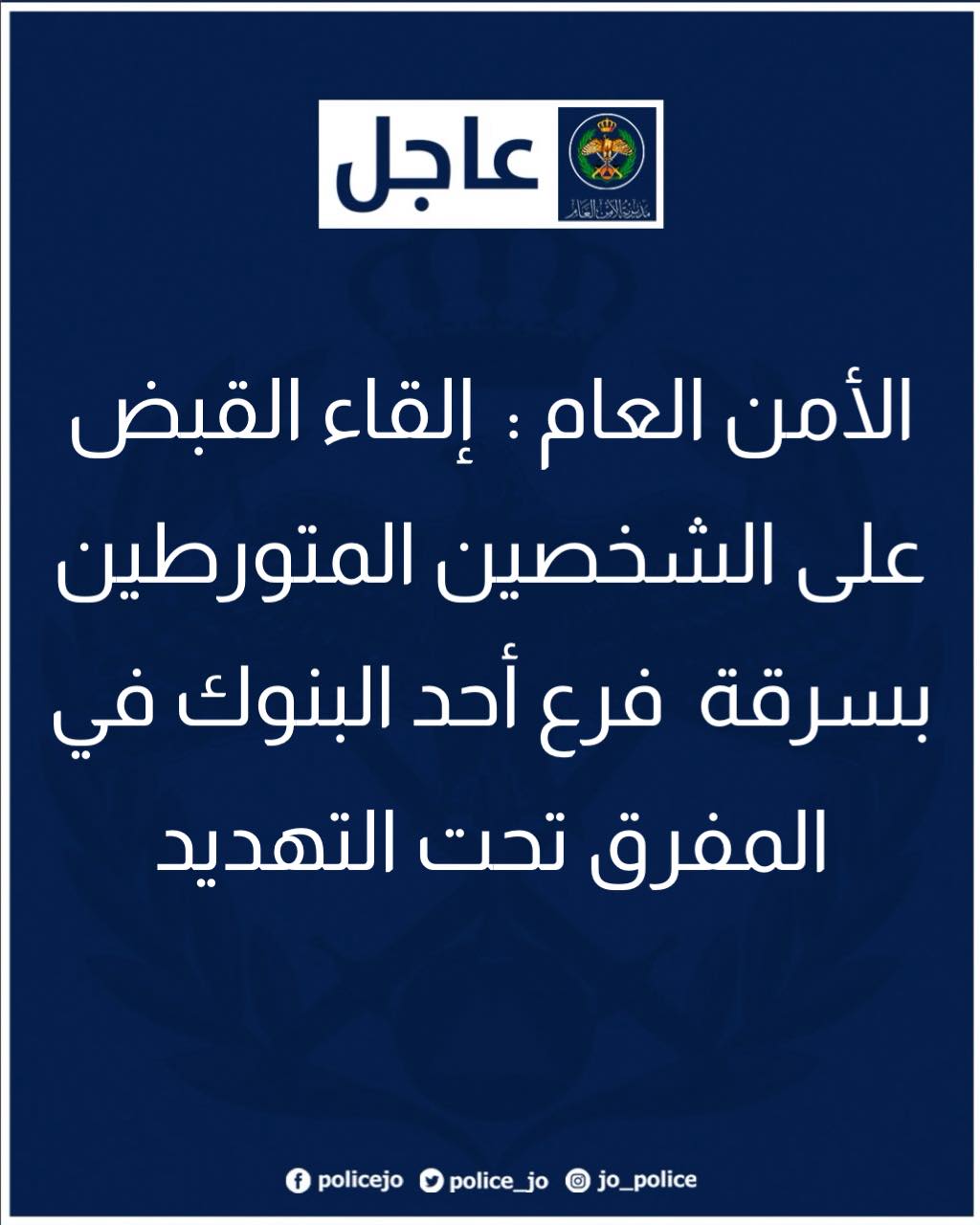 الأمن العام : إلقاء القبض على الشخصين المتورطين بسرقة فرع أحد البنوك في المفرق تحت التهديد