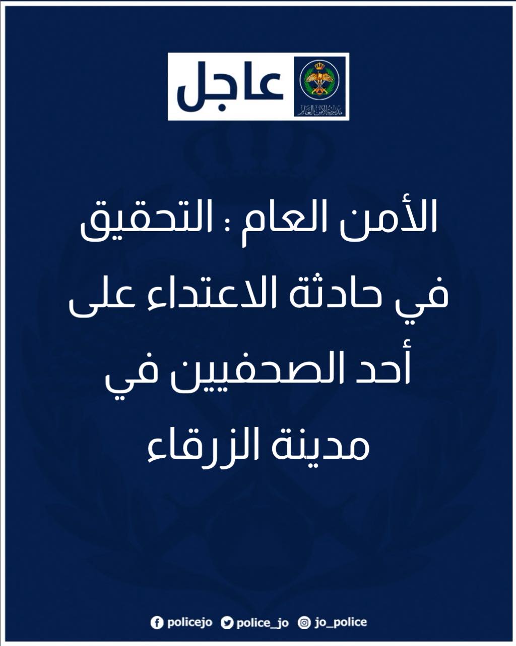 الأمن العام : التحقيق في حادثة الاعتداء على أحد الصحفيين في مدينة الزرقاء