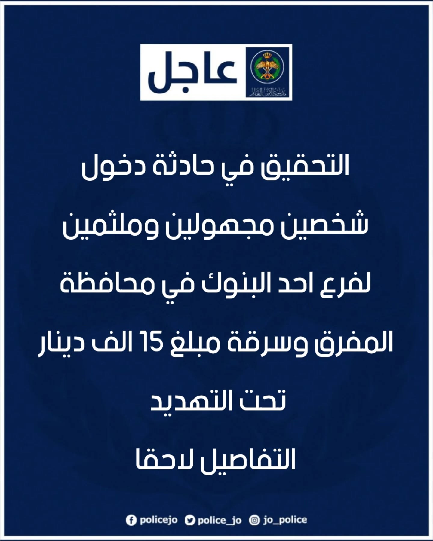 الأمن العام : التحقيق في حادثة دخول شخصين مجهولين وملثمين لفرع احد البنوك في محافظة المفرق