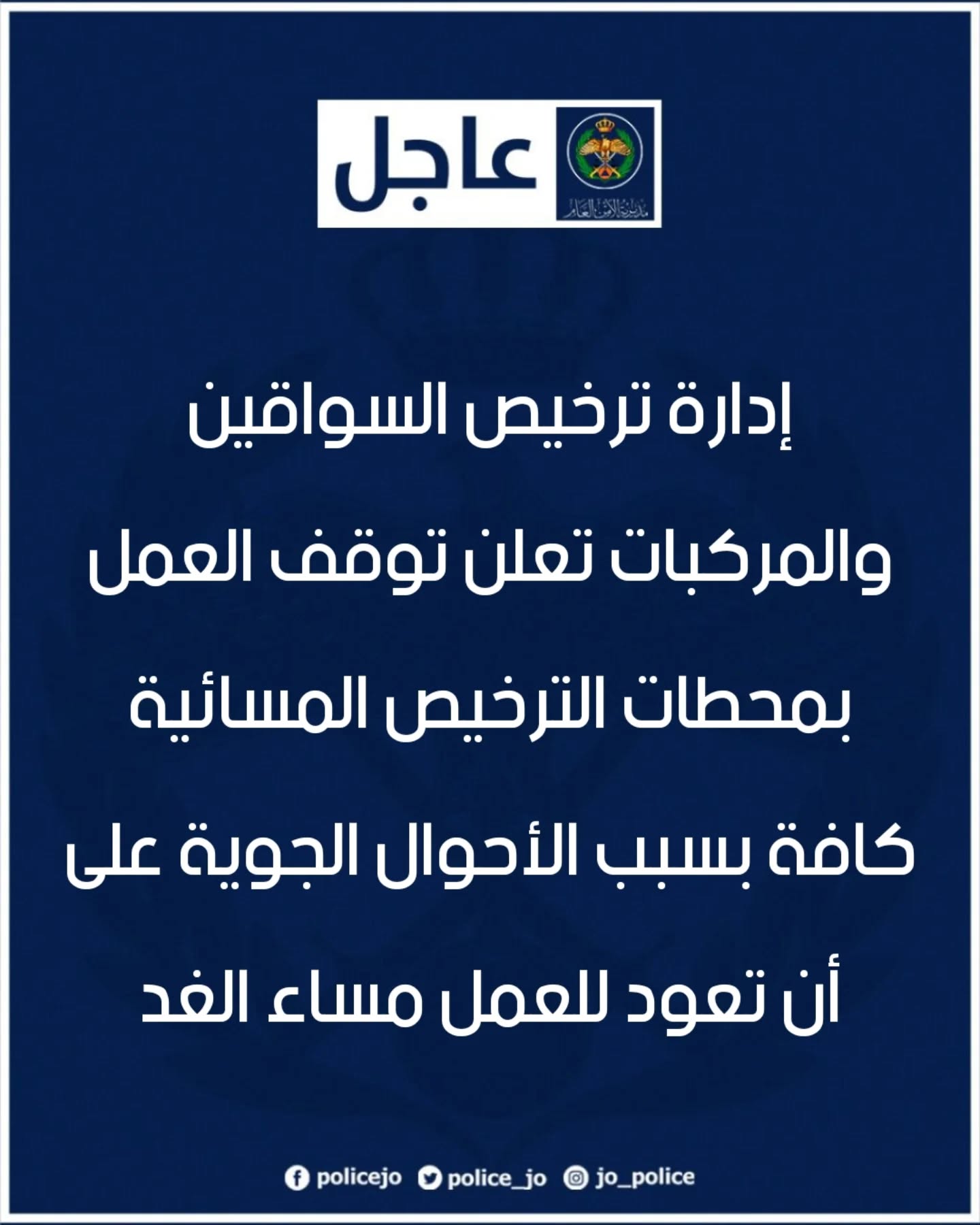 إدارة ترخيص السواقين والمركبات تعلن توقف العمل بمحطات الترخيص المسائية كافّة بسبب الأحوال الجوية على أن تعود للعمل مساء