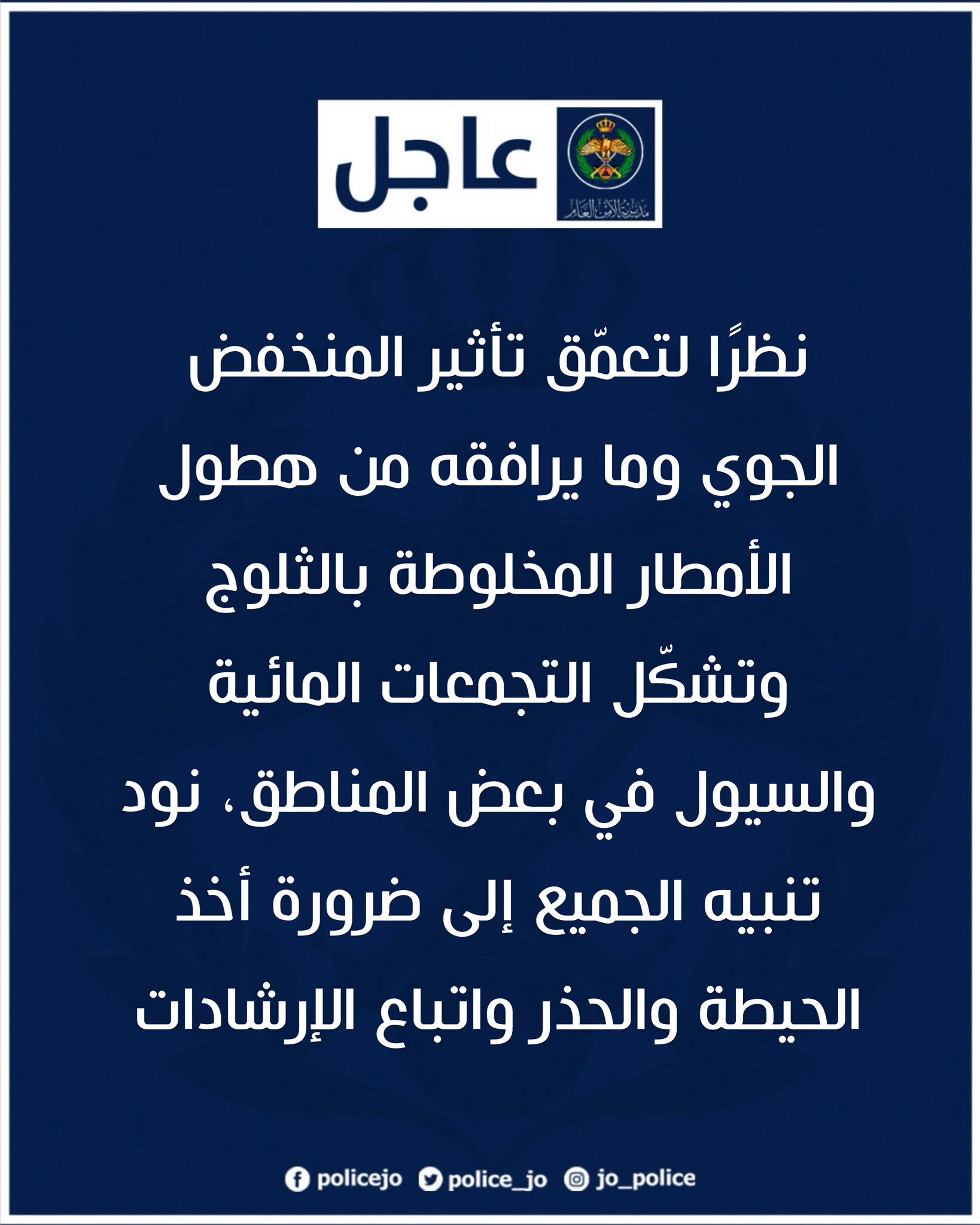 مديرية الأمن العام تحذر من تبعات المنخفض الجوي المتوقع وتدعو المواطنين للابتعاد عن الأودية ومجاري السيول