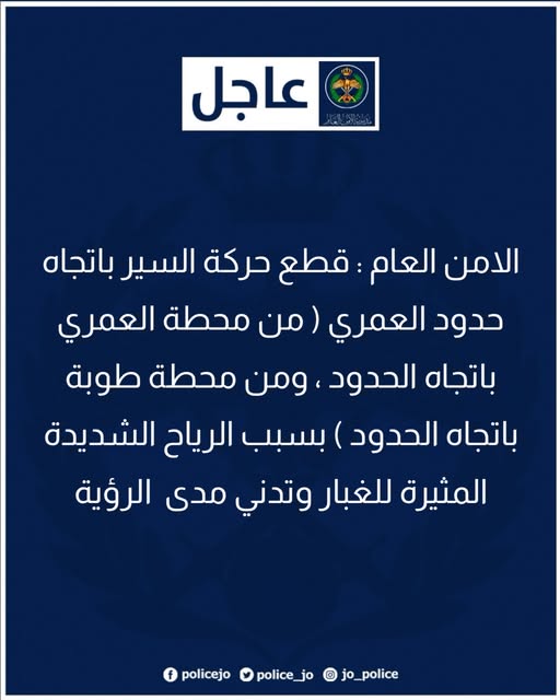الأمن العام : قطع حركة السير على الطريق الصحراوي من القطرانة باتجاه الجنوب ومن منطقة الحسا باتجاه العاصمة بسبب انعدام مدى الرؤية
