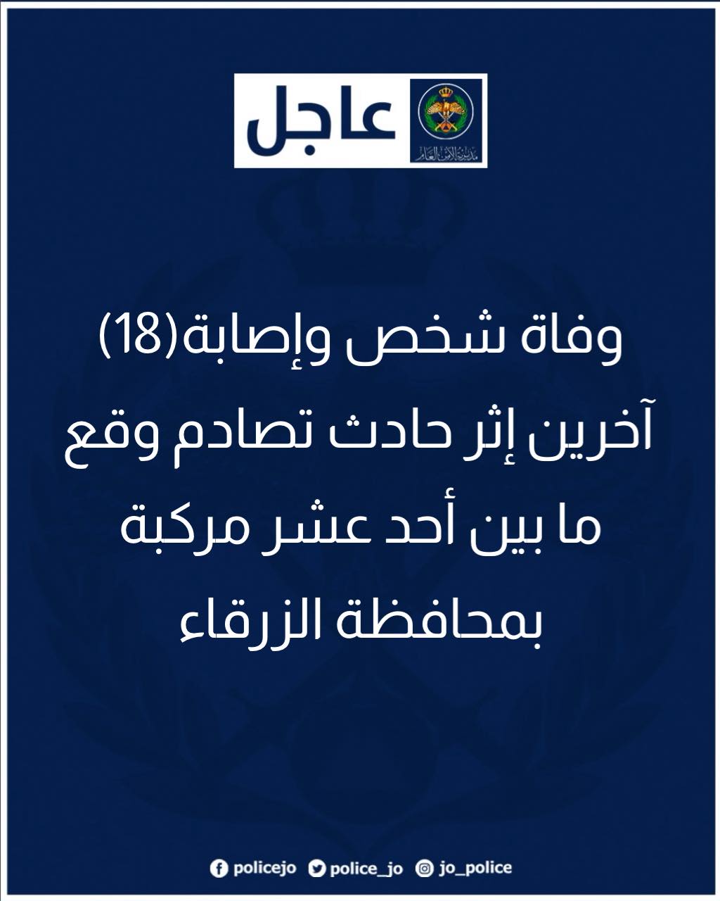 وفاة شخص وإصابة(18) آخرين إثر حادث تصادم وقع ما بين أحد عشر مركبة بمحافظة الزرقاء