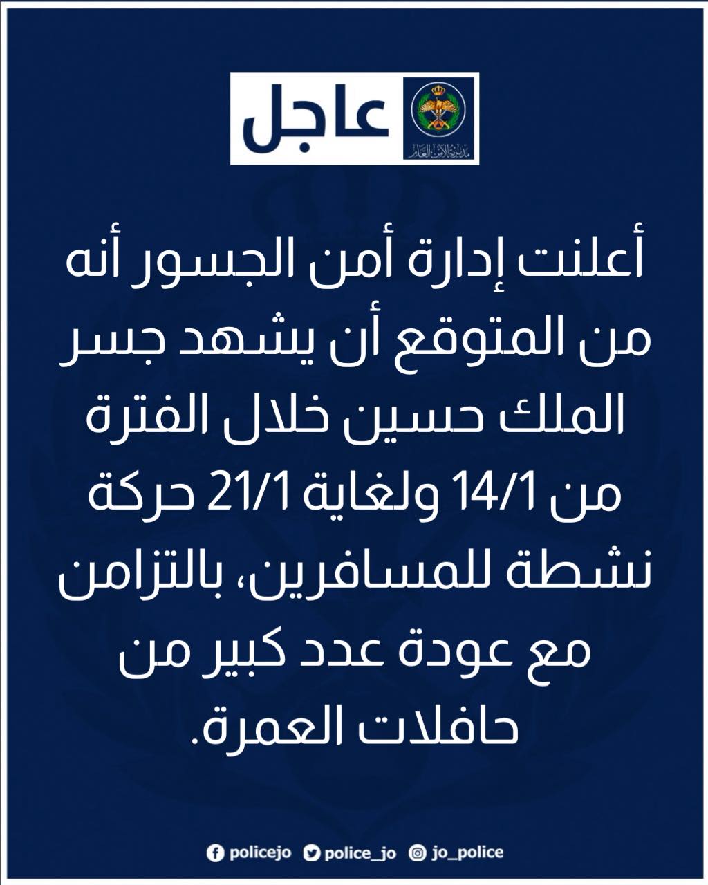 الأمن العام : قطع حركة السير باتجاه حدود العمري ( من محطة العمري باتجاه الحدود ، ومن محطة طوبة باتجاه الحدود )