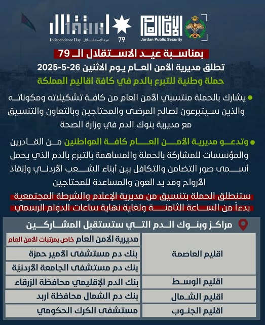 نفذت مديرية الأمن العام، بالتعاون مع وزارة الصحة والخدمات الطبية الملكية، الحملة الوطنية للتبرع بالدم "بعيدك سيدنا.. نخوتنا بدمنا"