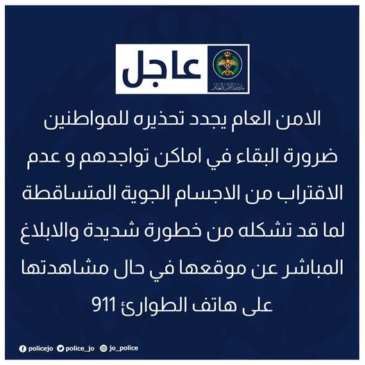 حذرت مديرية الأمن العام المواطنين من الأحوال الجوية المتوقعة خلال الأيام المقبلة، وذلك نتيجة تأثر المملكة بمنخفض جوي قوي