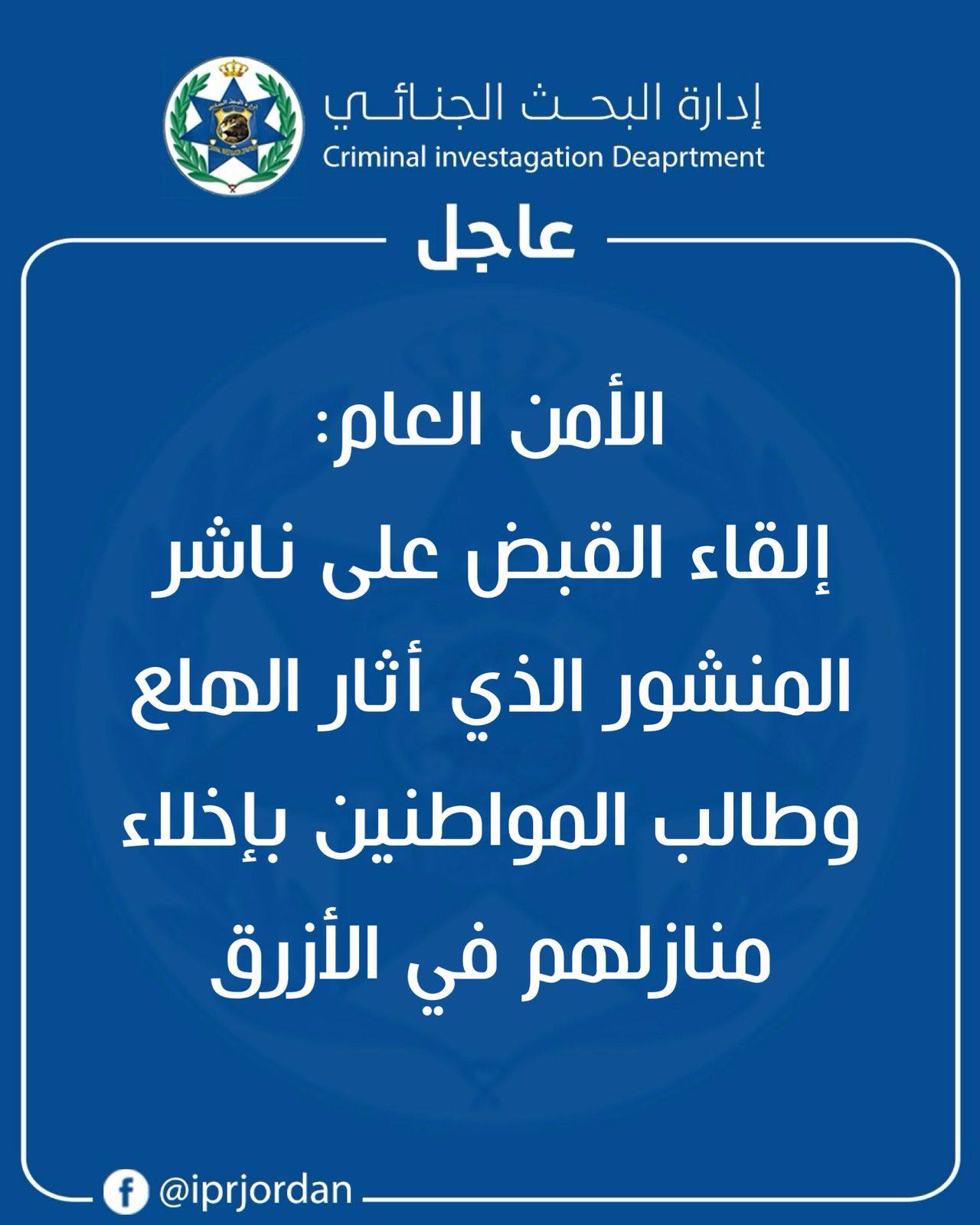 قال الناطق الإعلامي باسم مديرية الأمن العام إنّه من خلال التحقيقات في المنشور الذي أثار الهلع وطالب المواطنين بإخلاء منازلهم