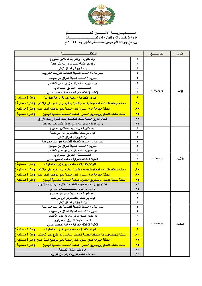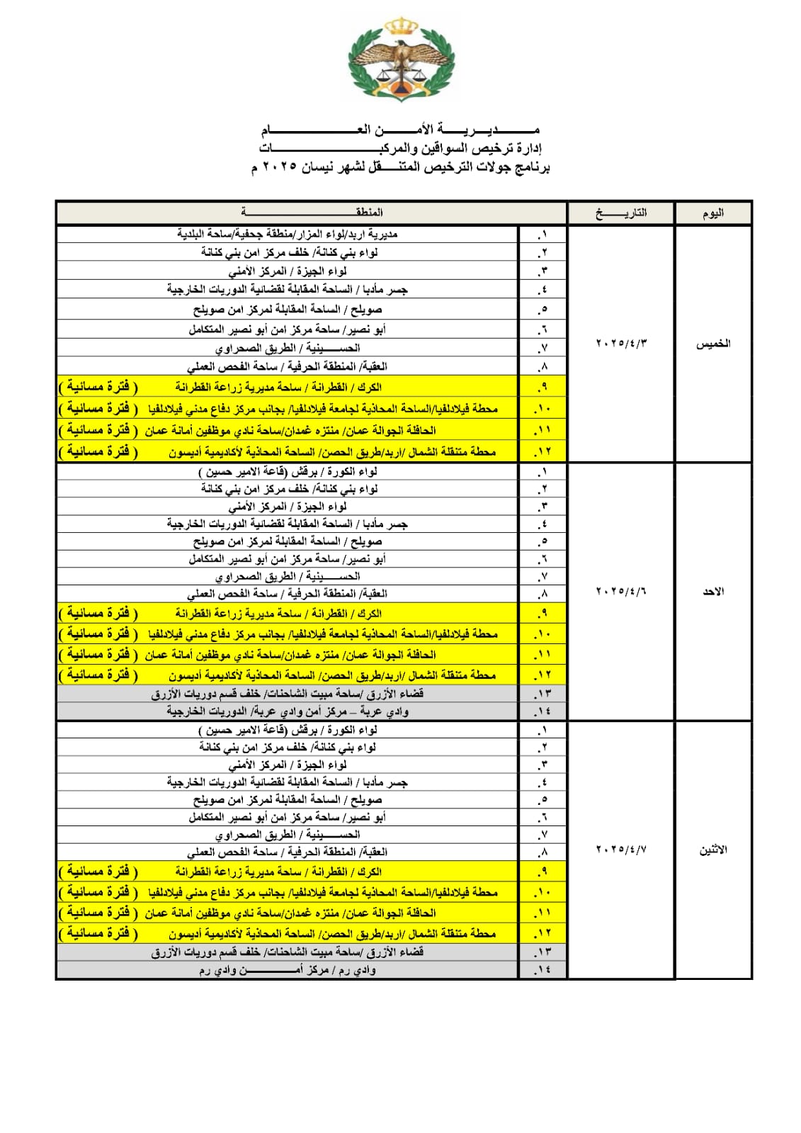 إدارة ترخيص السواقين والمركبات تعلن عن مواعيد العمل بجولات الترخيص المتنقل ضمن المبادرة الابتكارية ( بنوصلك ) خلال شهر كانون الثاني لعام 2025
