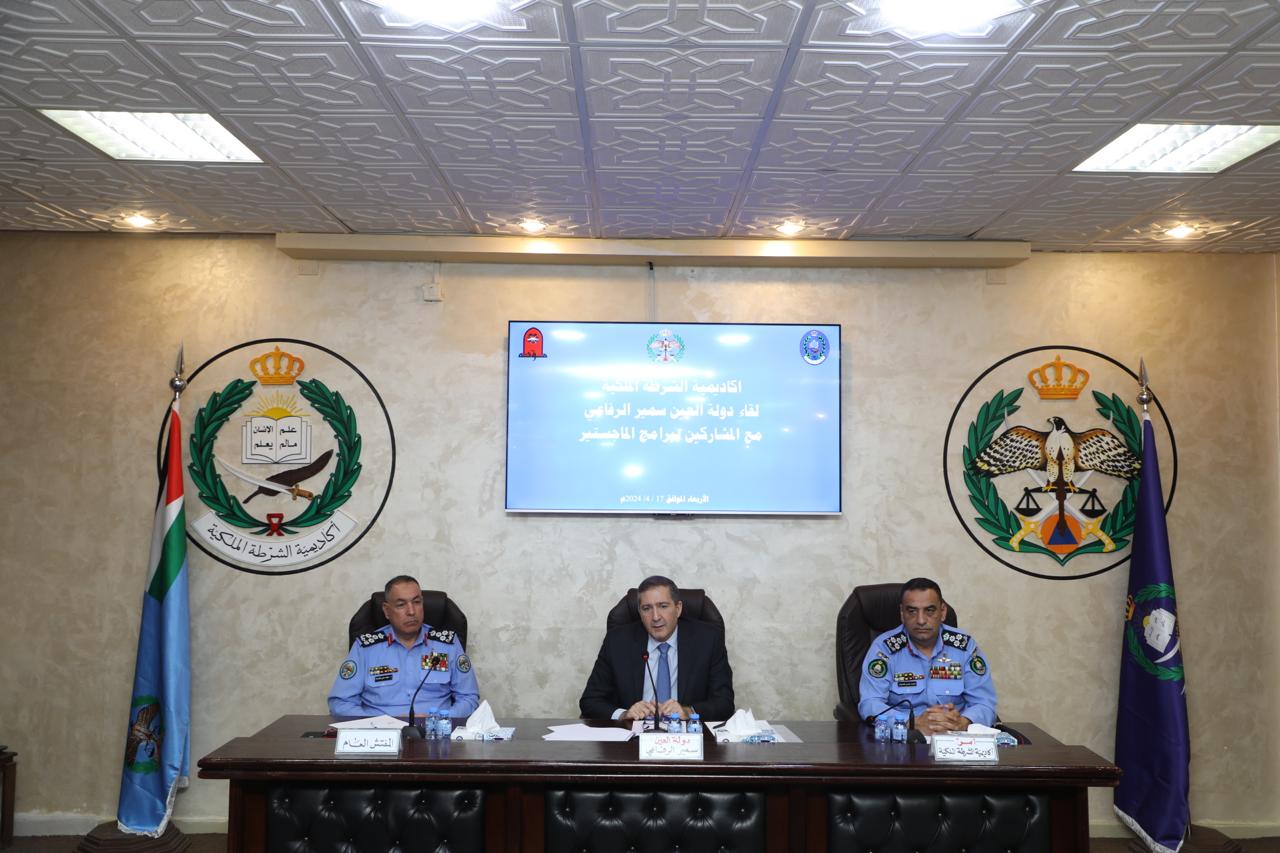 جانب من لقاءنائب سمو رئيس المركز الوطني للأمن وإدارة الأزمات العميد الركن حاتم الزعبي مع طلبة برامج الماجستير في أكاديمية الشرطة الملكية