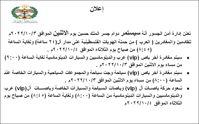 اعلان صادر عن إدارة أمن الجسور بخصوص دوام يوم الاثنين 3 /10 /2022