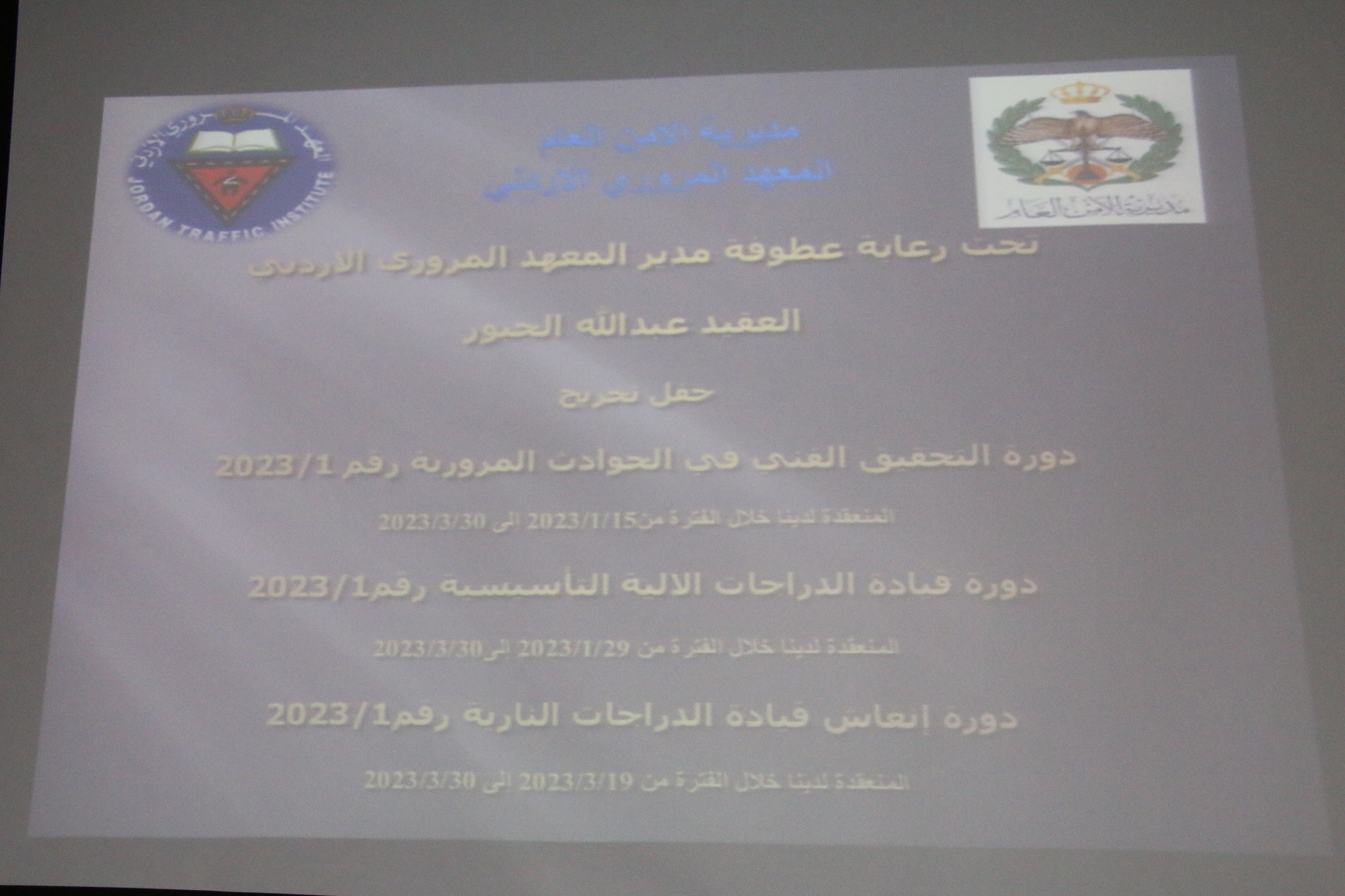 بحضور مدير المعهد المروري الأردني العقيد عبد الله عودة الجبور تم تخريج دورة قيادة الدراجات الإلية التأسيسية رقم (1/2023) بمشاركة (13) مشارك من مرتبات مديرية الأمن العام والتي عقدت في المعهد المروري الأردني
