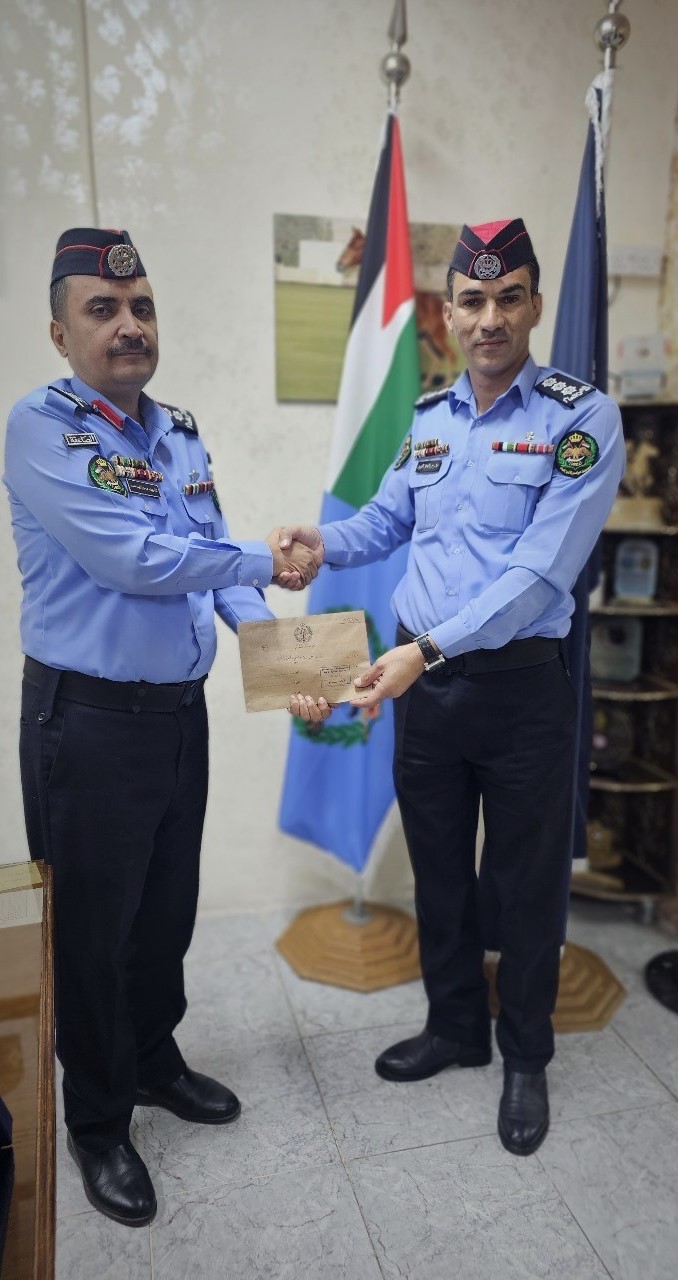 كرم قائد مجموعة مراسم الأمن العام بالإنابة الشريف حسين زيد أبو العصام النقيب خالد عبدالحافظ عواد من مرتب سرية مجموعة مراسم الأمن العام وذلك لفوزة بجائزة التميز الأمني لمرتبات مديرية الأمن تحت مسمى (التميز على المستوى الاداري للعام ٢٠٢٣) والتي تحققت نتيجة عمله الدؤوب والمتميز في أداء الواجبات والمهام الموكلة إليه.
