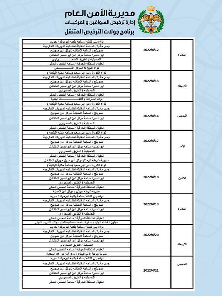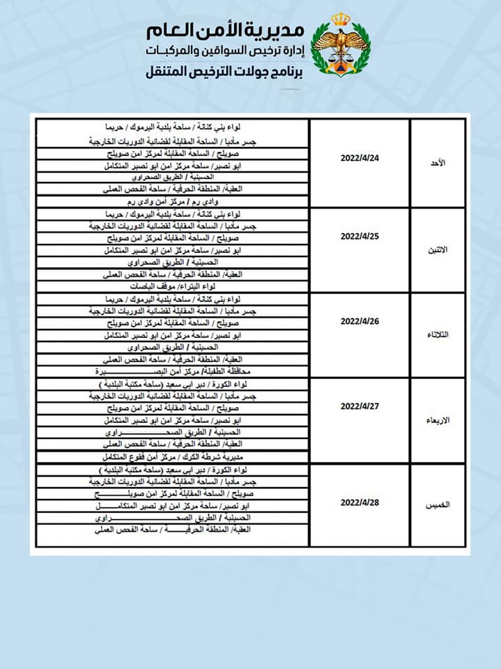 _ محطات الترخيص المتنقلة من الأحد ولغاية الخميس من الساعة العاشرة صباحا ولغاية الثانية بعد الظهر.