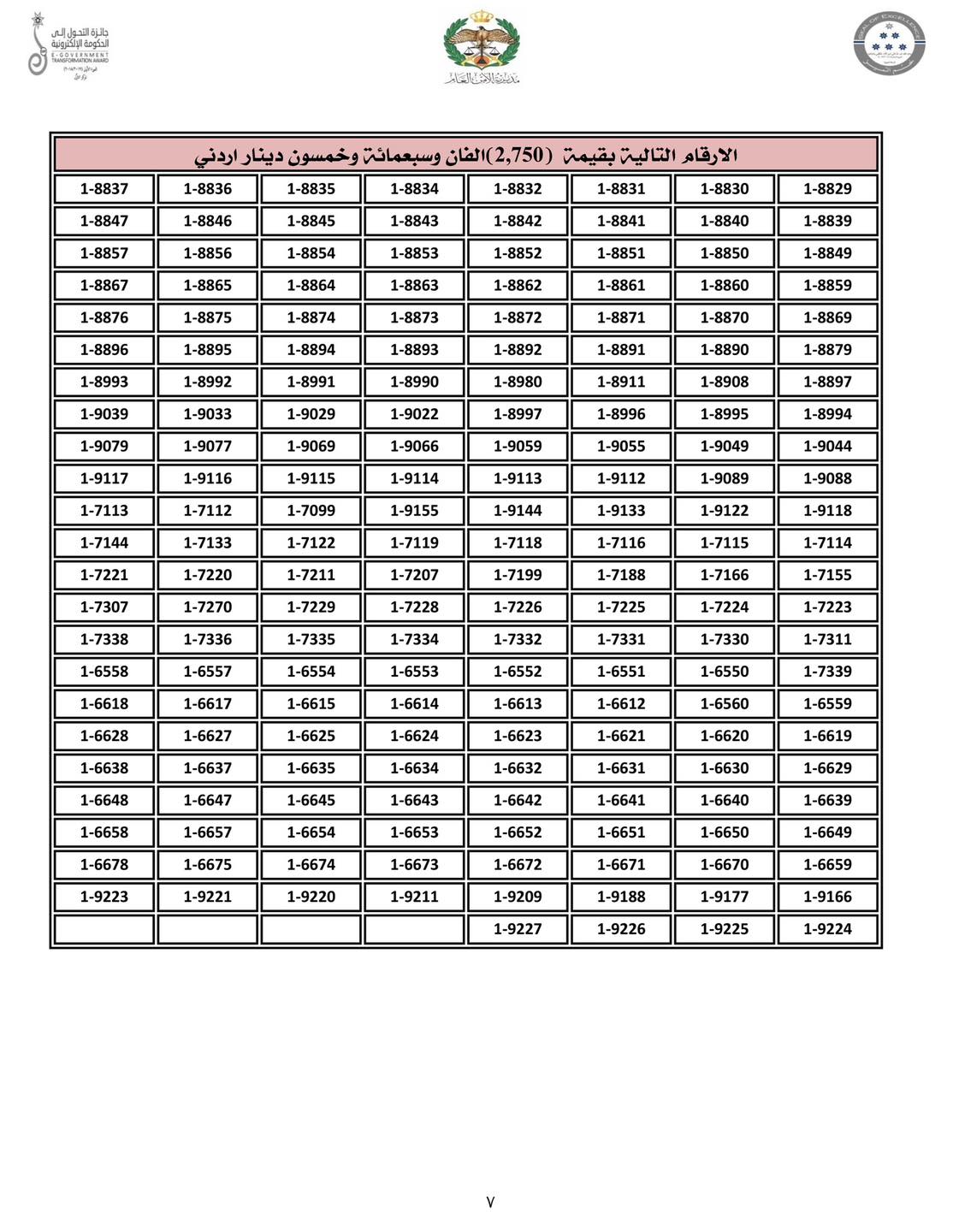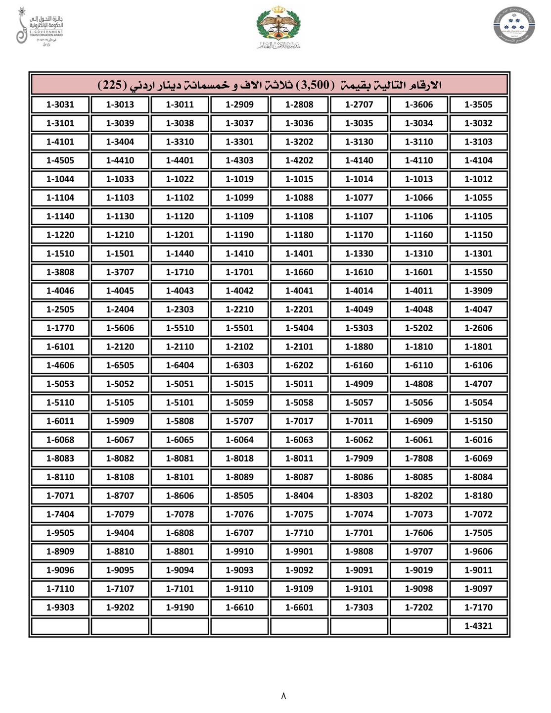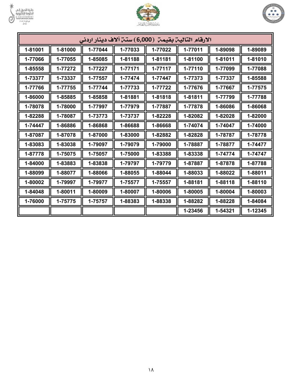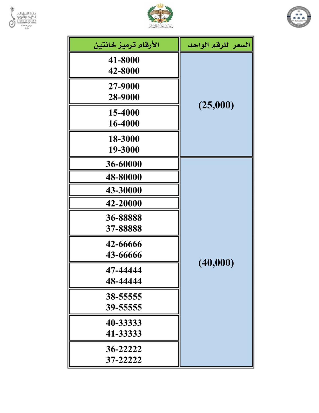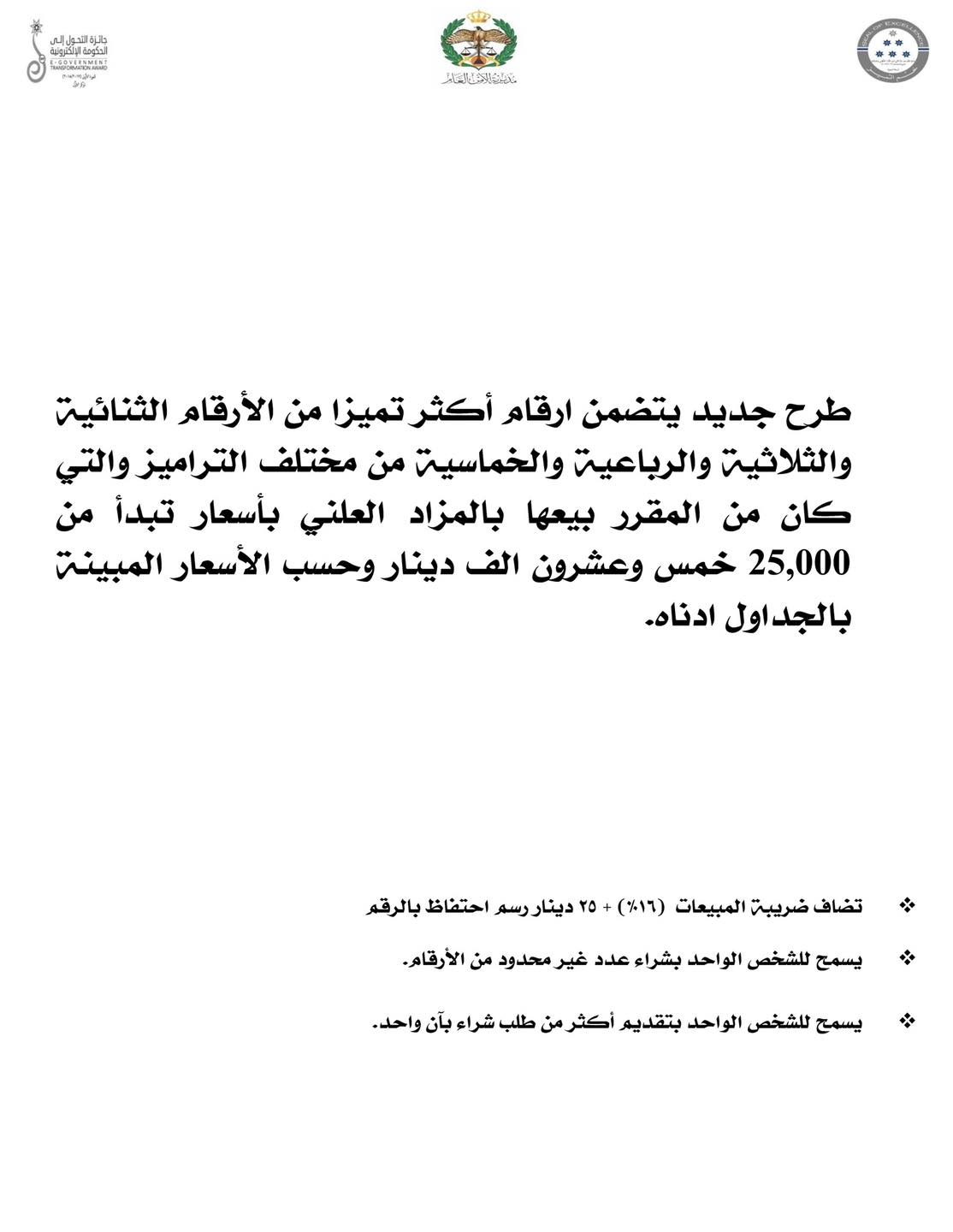 ** أرقام ثنائية وثلاثية ورباعية وخماسية من مختلف الترميزات، والتي كان مقرراً بيعها بالمزاد العلني بأسعار تبدأ من 25 ألف دينار