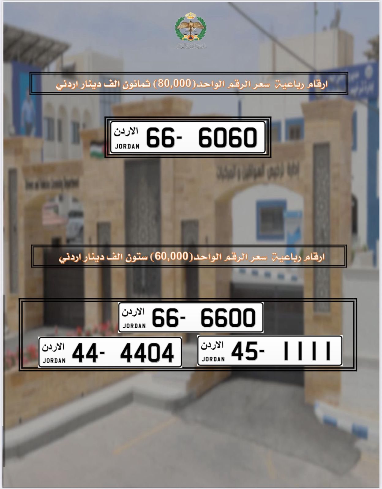 تعلن إدارة ترخيص السواقين والمركبات عن طرح مجموعة من الأرقام الأكثر تميزا من ترميز (66) ومن ترميز الخانتين المختلفتين والتي كان مقرر بيعها بالمزاد العلني للبيع المباشر من خلال البوابة الإلكترونية.