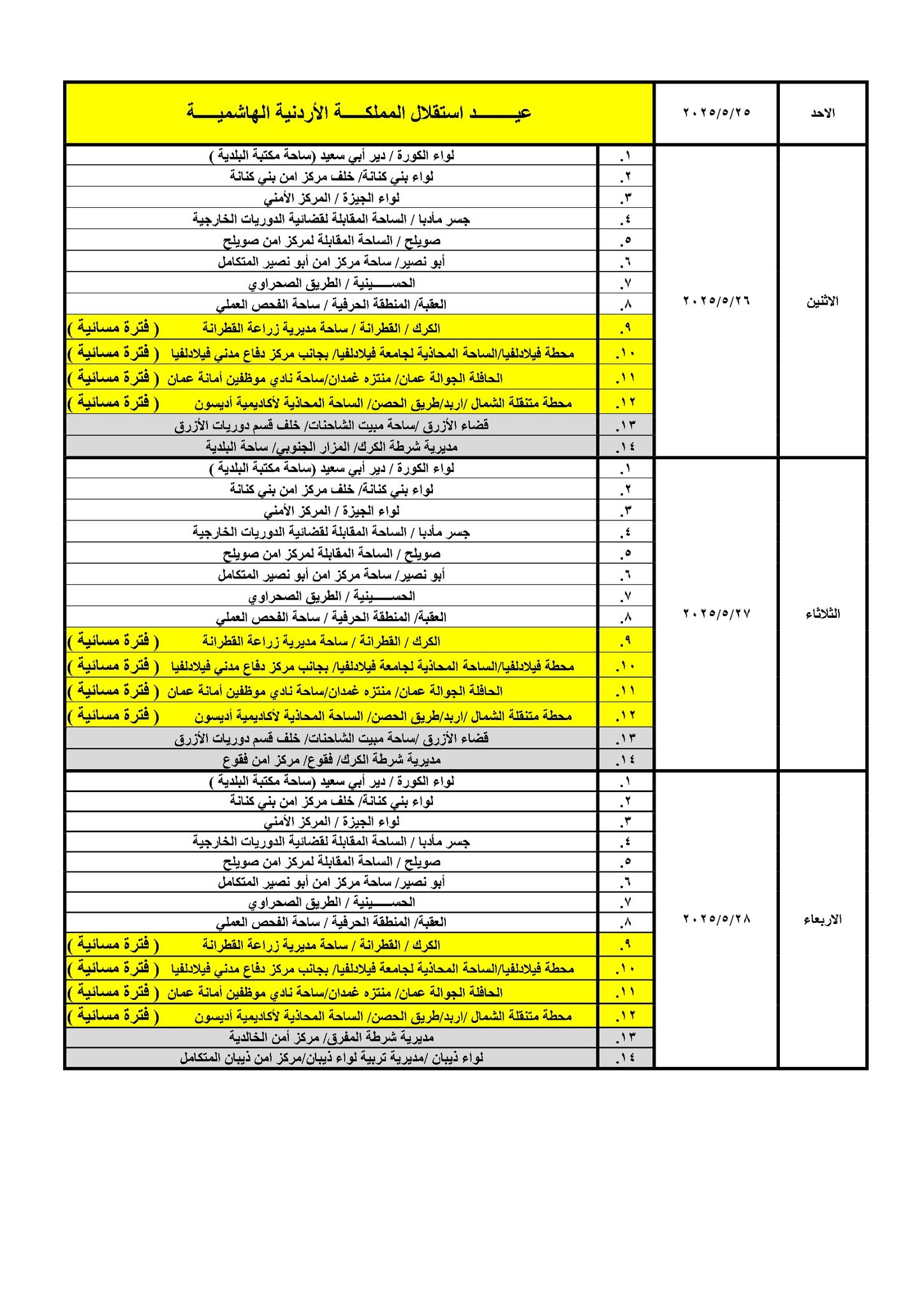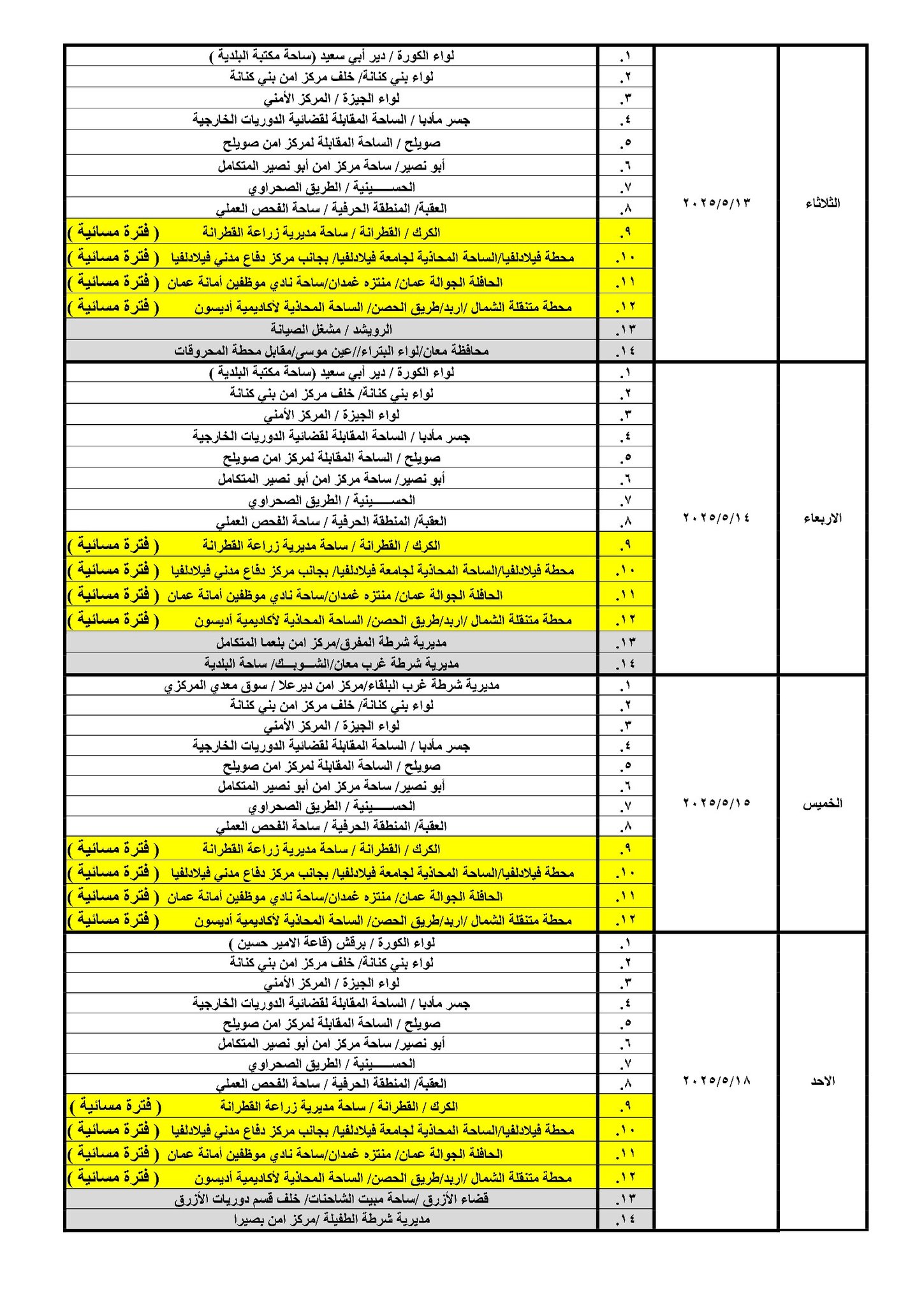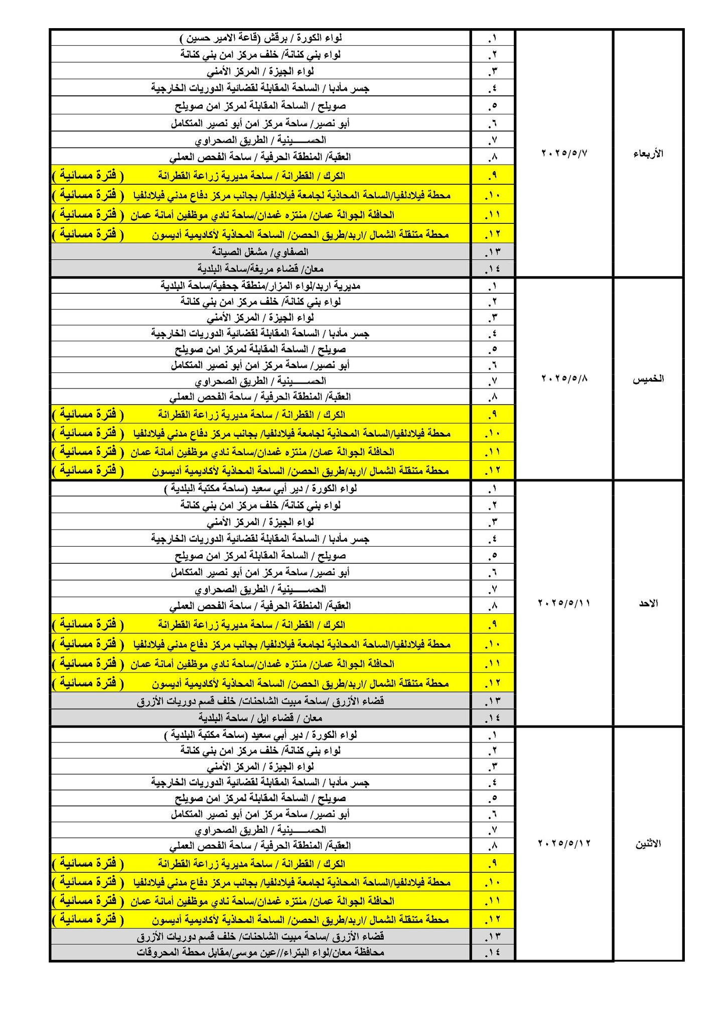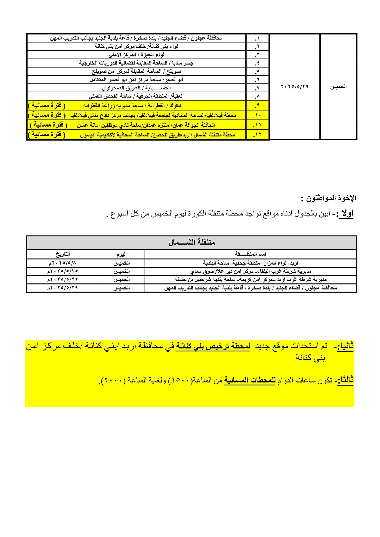 تعلن ادارة ترخيص السواقين والمركبات عن برنامج الترخيص المتنقل خلال شهر أيار لعام 2025م في عدد من مناطق المملكة حيث ستكون ساعات الدوام من يوم الأحد ولغاية يوم الأربعاء من الساعة (8:00) صباحاً وحتى الساعة (14:00) ظهراً، ويوم الخميس من الساعة (8:00) صباحاً ولغاية الساعة (13:00) ظهراً.