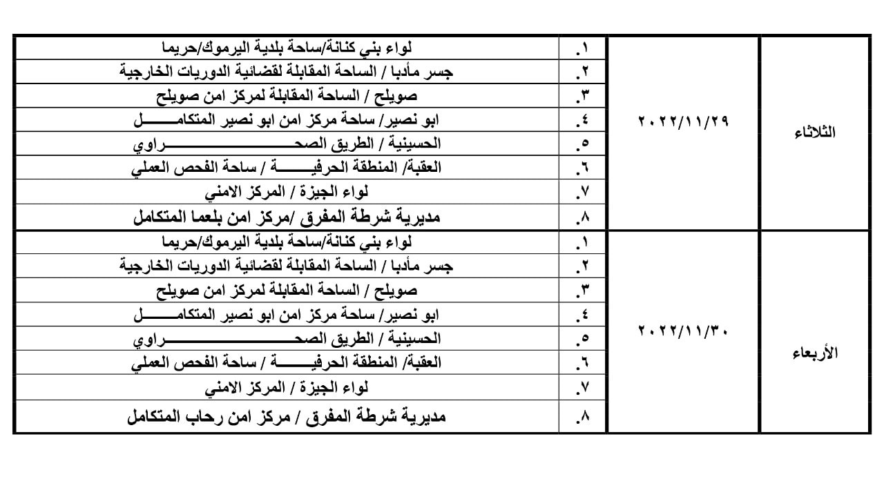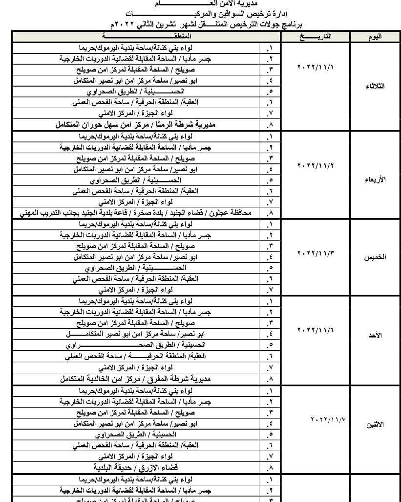 إدارة ترخيص السواقين والمركبات تعلن عن مواعيد العمل بجولات الترخيص المتنقل ضمن المبادرة الابتكارية ( بنوصلك ) خلال شهر تشرين الثاني لعام 2022م في عدد من مناطق المملكة ، حيث ستكون ساعات الدوام للترخيص المتنقل من يوم الأحد ولغاية يوم الأربعاء من الساعة 8:00 صباحاً وحتى الساعة 2:00 ظهراً، ويوم الخميس من الساعة 8:00 صباحاً ولغاية الساعة 1:00 ظهراً .
