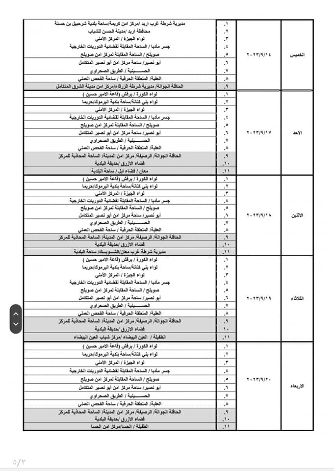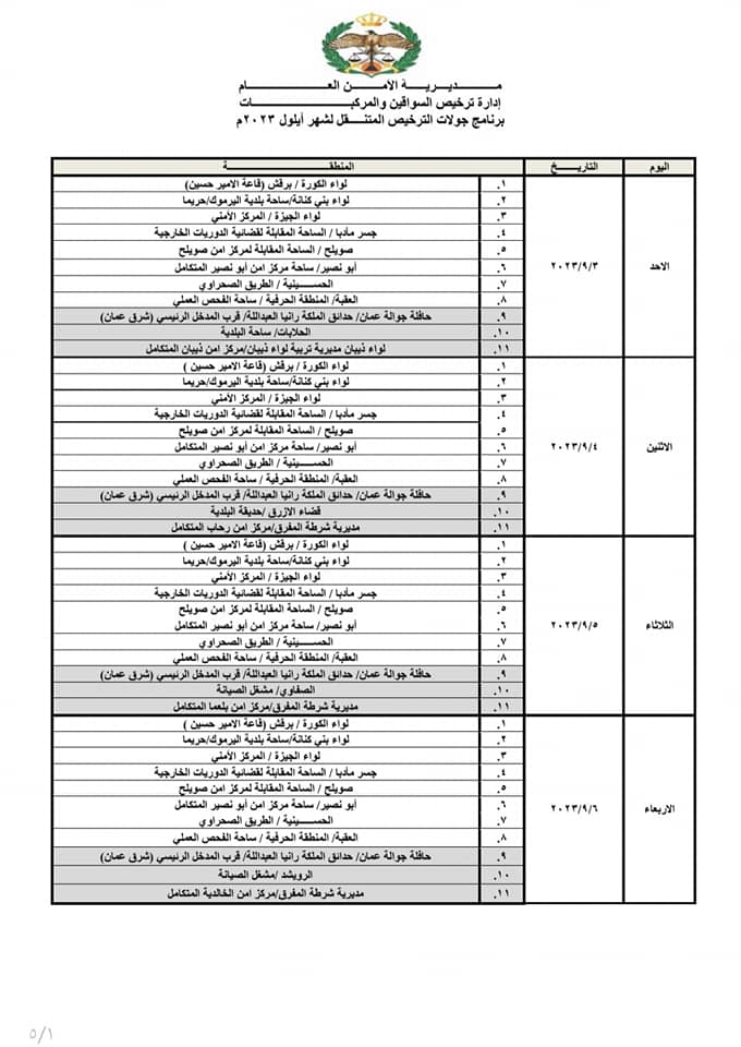 إدارة ترخيص السواقين والمركبات تعلن عن مواعيد العمل بجولات الترخيص المتنقل ضمن المبادرة الابتكارية ( بنوصلك ) خلال شهر أيلول لعام 2023م في عدد من مناطق المملكة ، حيث ستكون ساعات الدوام للترخيص المتنقل من يوم الأحد ولغاية يوم الأربعاء من الساعة 8:00 صباحاً وحتى الساعة 2:00 ظهراً، ويوم الخميس من الساعة 8:00 صباحاً ولغاية الساعة 1:00 ظهراً.