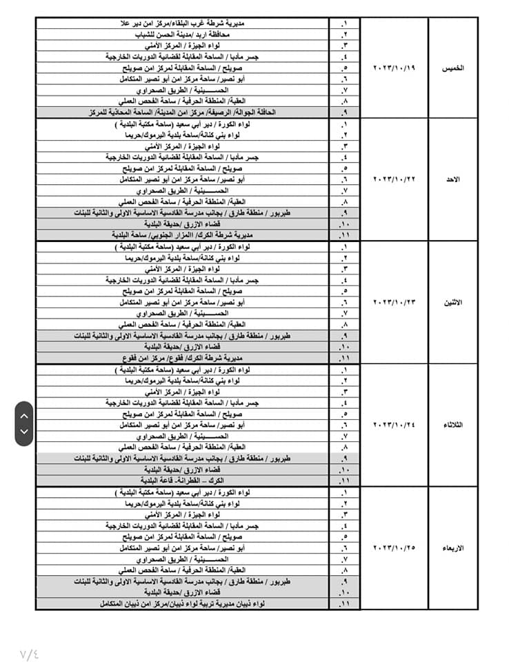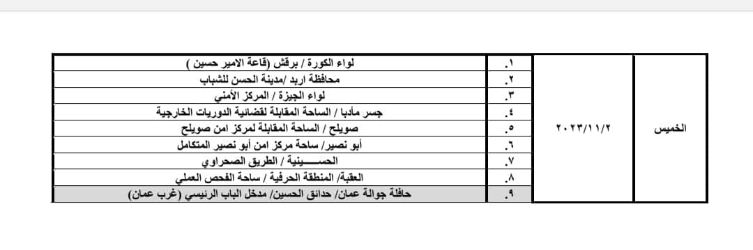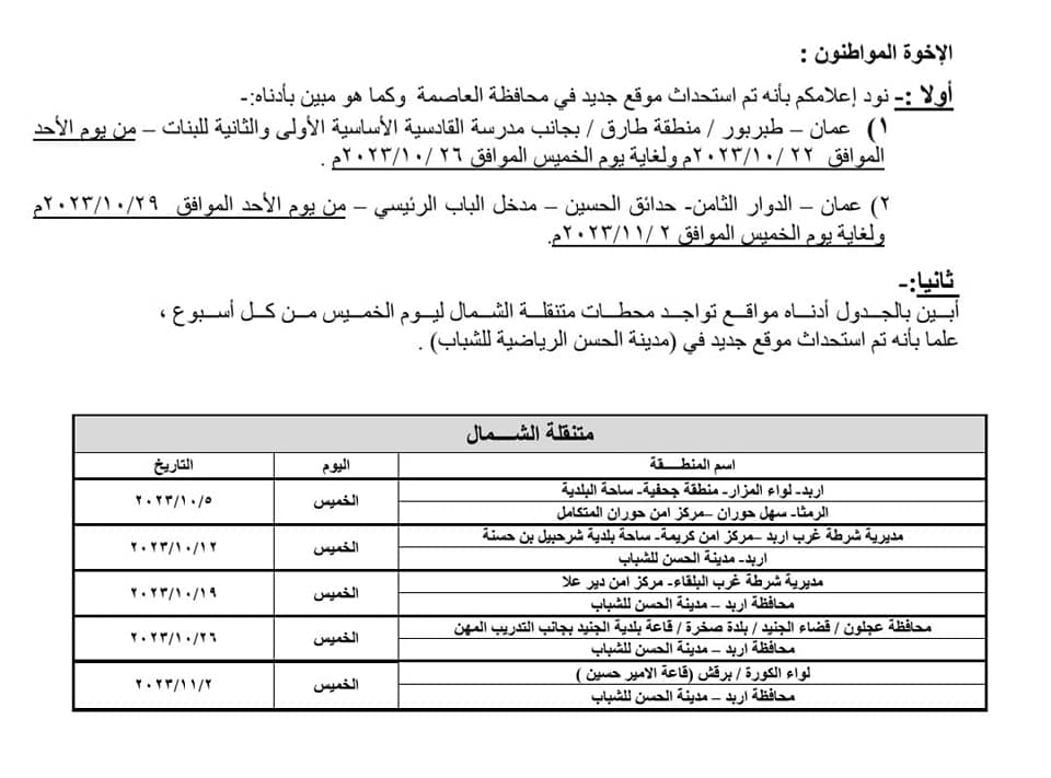 إدارة ترخيص السواقين والمركبات تعلن عن مواعيد العمل بجولات الترخيص المتنقل ضمن المبادرة الابتكارية ( بنوصلك ) خلال شهر تشرين الأول لعام 2023م في عدد من مناطق المملكة ، حيث ستكون ساعات الدوام للترخيص المتنقل من يوم الأحد ولغاية يوم الأربعاء من الساعة 8:00 صباحاً وحتى الساعة 2:00 ظهراً، ويوم الخميس من الساعة 8:00 صباحاً ولغاية الساعة 1:00 ظهراً.